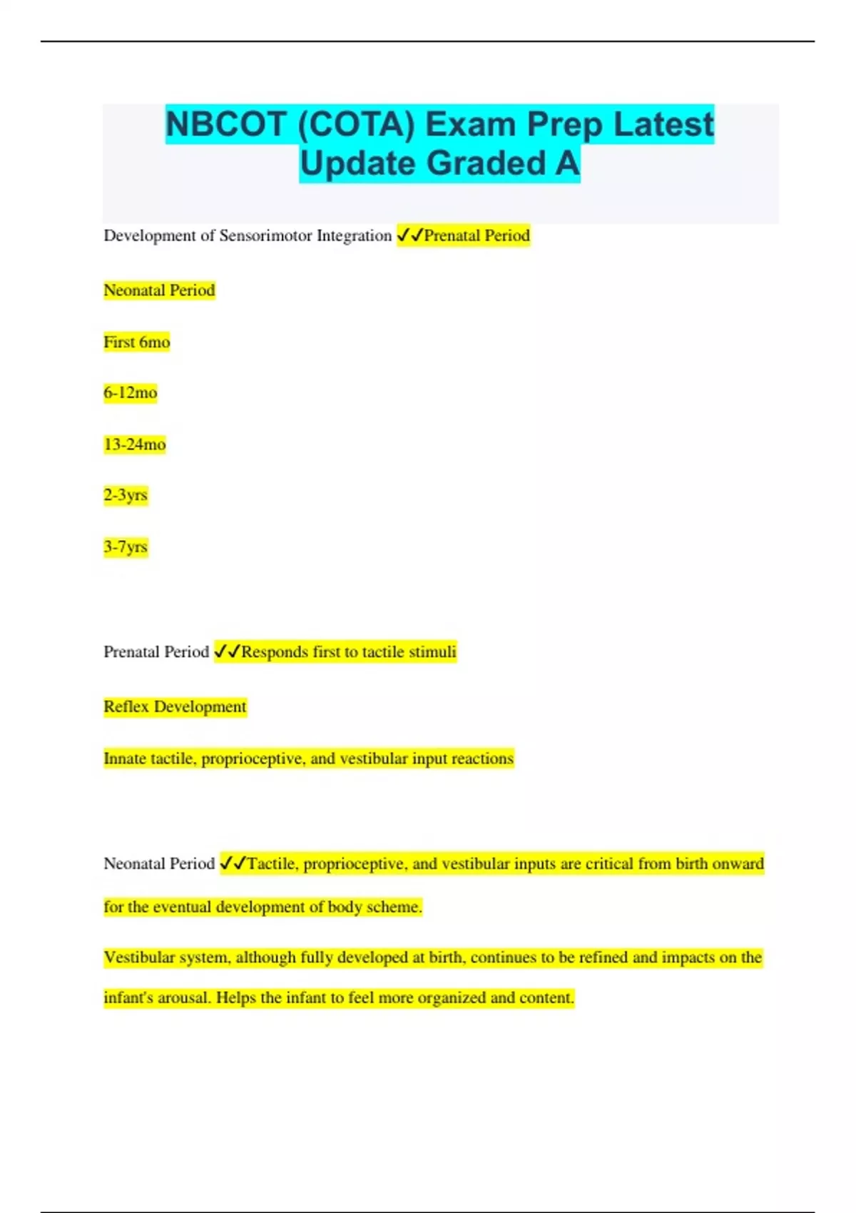 NBCOT (COTA) Exam Prep Latest Update Graded A Development of Sensorimotor Integration Prenatal Period Neonatal Period First 6mo 6-12mo 13-24mo 2-3yrs 3-7yrs Prenatal Period Responds first to tactile stimuli Reflex Development Innate tactile, proprioceptive, and vestibular input reactions Neonatal Period Tactile, proprioceptive, and vestibular inputs are critical from birth onward for the eventual development of body scheme. Vestibular system, although fully developed at birth, continues to be refined and impacts on the infant's arousal. Helps the infant to feel more organized and content. Visual system develops as infant responds to human faces and items of high contrast places approximately 10in from the face. Auditory system is immature at birth and develops as the infant orients to voices and other sounds. First 6mo Vestibular, proprioceptive, and visual systems become more integrated and lay the foundation for postural control, which facilitates a steady visual field. Tactile and proprioceptive systems continue to be refined, laying the foundation for development of somatosensory skills. Visual and tactile systems become more integrated as the child reaches out and grasps objects, laying the foundation for eye-hand coordination. Infant movement patterns progress from reflexive to voluntary and goal directed. 6-12mo Vestibular, visual, and somatosensory responses increase in quantity and quality as the infant becomes more mobile. Tactile and proprioceptive perception becomes more refined, allowing for development of fine motor and motor planning skills. Tactile and proprioceptive responses also lead to midline skills and eventual crossing of midline. Auditory, tactle, and proprioceptive perception is heightened allowing for development of sounds for the purpose of communication. Tactile, proprioceptive, gustatory, and olfactory perception are integrated, allowing for primitive self-feeding. 13-24mo Tactile perception becomes more precise allowing for discrimination and localization to further refinement of fine motor skills. Further integration of all systems promotes the complexity of motor planning as the toddler's repertoire of movement patterns expands. Symbolic gesturing and vocalization promotes ideation, indicating the toddler's ability to conceptualize. Motor planning abilities contribute to self-concept as the toddler begins to master the environment. 2-3yrs This is a period of refinement as the vestibular, proprioceptive, and visual systems further develop, leading to improved balance and postural control. Further development of tactile discrimination and localization lead to improved fine motor skills. Motor planning and praxis ideation also progresses during this period for more skillful occupational performance. 3-7yrs Child is driven to challenge sensorimotor competencies through roughhouse play, playground activities, games, sports, music, dancing , arts and crafts, household chores, and school tasks. These occupations provide opportunities to promote psychosocial development and self-esteem. Crossing Midline As the child becomes more mobile, movement against gravity and weightshift increase, leading to eventual crossing of the midline, often in attempt to reach for a toy, while weightbearing on the opposing upper extremity for balance. Begins at 9-12mo. Laterality Hemispheric specialization for specific tasks varies with different individuals Bilateral Integration As the child experiments with movement, the nervous system is stimulated, and the resulting sensations help the child to coordinate the two sides of the body. Begins at 9-12mo. Visual-Motor Integration Dependent upon the lower level skills of visual attention, visual memory, visual discrimination, kinesthesia, position in space, figure ground, form constancy, and spatial relations. Oral-Motor Control Developed in the area of feeding, provides the foundation