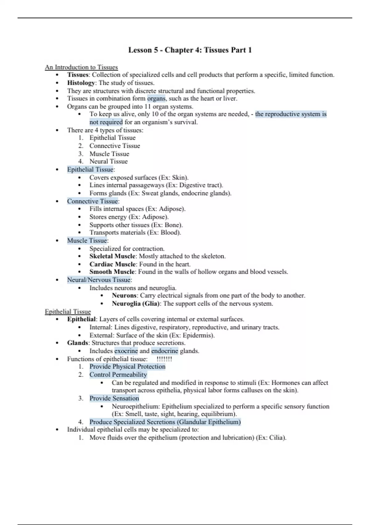 BSC 2085 - Lesson 5, Chapter 4: Tissues Part 1