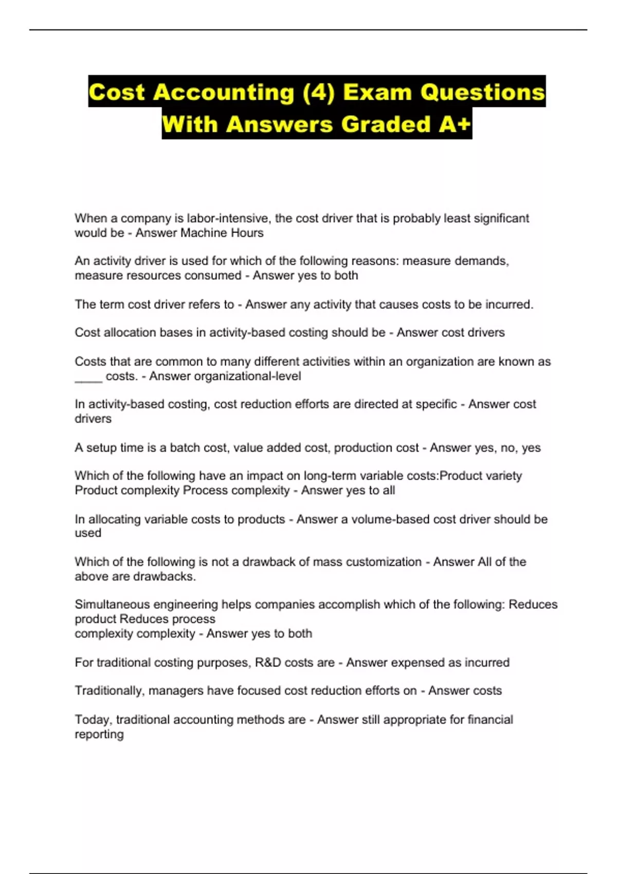 Cost Accounting (4) Exam Questions With Answers Graded A+...