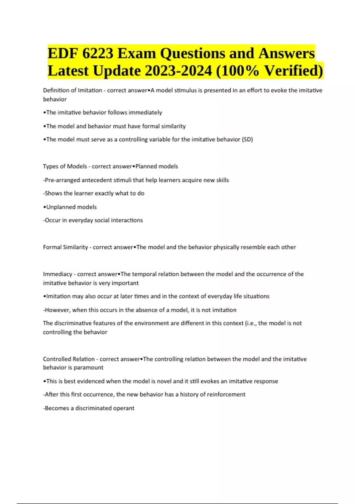 EDF 6223 Exam Questions and Answers Latest Update (100% Verified). Definition of Imitation - correct answer•A model stimulus is presented in an effort to evoke the imitative behavior •The imitative behavior follows immediately •The model and behavior must have formal similarity •The model must serve as a controlling variable for the imitative behavior (SD) Types of Models - correct answer•Planned models -Pre-arranged antecedent stimuli that help learners acquire new skills -Shows the learner exactly what to do •Unplanned models -Occur in everyday social interactions Formal Similarity - correct answer•The model and the behavior physically resemble each other Immediacy - correct answer•The temporal relation between the model and the occurrence of the imitative behavior is very important •Imitation may also occur at later times and in the context of everyday life situations -However, when this occurs in the absence of a model, it is not imitation The discriminative features of the environment are different in this context (i.e., the model is not controlling the behavior Controlled Relation - correct answer•The controlling relation between the model and the imitative behavior is paramount •This is best evidenced when the model is novel and it still evokes an imitative response -After this first occurrence, the new behavior has a history of reinforcement -Becomes a discriminated operant EDF 6223 Exam Questions and Answers Latest Update (100% Verified) Imitation Training - correct answer•Some children with disabilities require instruction in order to learn to imitate •Objective: to teach children to "do what the model does" -Generalize a rule to imitate models -Also known as generalized imitation Steps to Imitation Training(Striefel, 1974) - correct answer•Assess and teach any prerequisite skills for imitation training •Select models for training •Pretest •Sequence models for training •Perform imitation training Assessing/Teaching Prerequisite Skills - correct answer•Prerequisite skills needed: -Attending (staying seated, keeping hands in lap, looking at teacher when name is called, looking at objects when prompted by teacher) -Problem behaviors that may interfere with training may need to be decreased Selecting Models for Training - correct answer•Begin with selecting about 25 •Include gross and fine motor examples -Movement of body parts -Manipulation of physical objects •Use only one at a time (don't sequence them--save sequences for later) Pretesting - correct answer•Purpose: to determine if individual already imitates some models •Procedures: -Get learner in "ready" position -If object to be used, place it in front of individual -Say learner's name, and then "do this" -Present the model -Immediately praise all responses with formal similarity to the model -Record learner's response as correct or incorrect Sequencing the Selected Models for Training - correct answer•Arrange from easiest to most difficult •First models for training are ones the individual imitated correctly on some, but not all, pretest items •Next, teach ones the learner approximated but did incorrectly on pretest •Finally, teach items the learner did not perform or performed incorrectly on pretest Performing Imitation Training: Pre-Assessment - correct answer•Pre-assessment -Purpose: evaluate learner's current performance level and determine progress in learning to respond to model -Brief pretest prior to each training session -Use first 3 models currently selected for training -Present them 3 times in random order -If learner performs them correctly 3 times, remove from training sequence Performing Imitation Training: Training - correct answer•Training -Use repeated presentations of 1 of the 3 models in pre-assessment -Use model most often responded to or responded to with closest similarity during pre-assessment -Continue until learner responds correctly 5 consecutive times -Use physical guidance if necessary, to prompt the response -Gradually fade prompts as quickly as possible Performing Imitation Training: Post Assessment - correct answer•Post-assessment -Purpose: to evaluate how well learner can perform previously- and recently-learned behaviors -Present 5 previously learned models and 5 models still in training -On 3 consecutive post-assessments •If child has imitated a model incorrectly on 14 of 15 trials, remove it from training -Physical guidance may be used Performing Imitation Training: Probes - correct answer•Probes for imitative behavior -Purpose: assesses for generalized imitation -Select 5 non-trained, novel models to check for occurrence of imitation -Do at end of each training session or intermix in training sessions Use pre-assessment procedures (no antecedent or response prompts Guidelines for imitation training - correct answer•Keep training sessions active and short (10-15 minutes, a couple times a day) •Reinforce both prompted and imitative responses •Pair verbal praise and attention with tangible reinforcers •If progress breaks down, back up and move ahead slowly •Keep a record •Fade out verbal response prompts and physical guidance What is Shaping? - correct answer•A process in which one