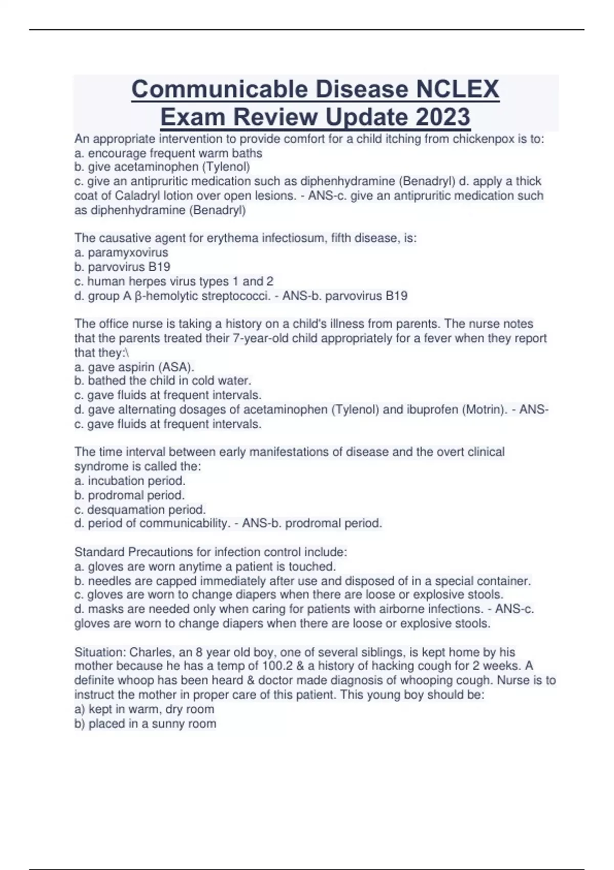 Communicable Disease NCLEX Exam Review Update 2023 An appropriate intervention to provide comfort for a child itching from chickenpox is to: a. encourage frequent warm baths b. give acetaminophen (Tylenol) c. give an antipruritic medication such as diphenhydramine (Benadryl) d. apply a thick coat of Caladryl lotion over open lesions. - ANS-c. give an antipruritic medication such as diphenhydramine (Benadryl) The causative agent for erythema infectiosum, fifth disease, is: a. paramyxovirus b. parvovirus B19 c. human herpes virus types 1 and 2 d. group A β-hemolytic streptococci. - ANS-b. parvovirus B19 The office nurse is taking a history on a child's illness from parents. The nurse notes that the parents treated their 7-year-old child appropriately for a fever when they report that they: a. gave aspirin (ASA). b. bathed the child in cold water. c. gave fluids at frequent intervals. d. gave alternating dosages of acetaminophen (Tylenol) and ibuprofen (Motrin). - ANSc. gave fluids at frequent intervals. The time interval between early manifestations of disease and the overt clinical syndrome is called the: a. incubation period. b. prodromal period. c. desquamation period. d. period of communicability. - ANS-b. prodromal period. Standard Precautions for infection control include: a. gloves are worn anytime a patient is touched. b. needles are capped immediately after use and disposed of in a special container. c. gloves are worn to change diapers when there are loose or explosive stools. d. masks are needed only when caring for patients with airborne infections. - ANS-c. gloves are worn to change diapers when there are loose or explosive stools. Situation: Charles, an 8 year old boy, one of several siblings, is kept home by his mother because he has a temp of 100.2 & a history of hacking cough for 2 weeks. A definite whoop has been heard & doctor made diagnosis of whooping cough. Nurse is to instruct the mother in proper care of this patient. This young boy should be: a) kept in warm, dry room b) placed in a sunny room c) kept in a room with a temperature of 60F d) allowed free run of the house - ANS-a) kept in warm, dry room Situation: Bobby, 3 years old, from a family of 4 older siblings, a mother & a father, was admitted to the hospital w/temperature of 101 F, a sore throat of 4 days duration, w/ difficulty swallowing, & a moderate cervical adenitis. A diagnosis of pharyngeal diphtheria was made. The best means for providing complete bed rest for the child include: CONTINUES...
