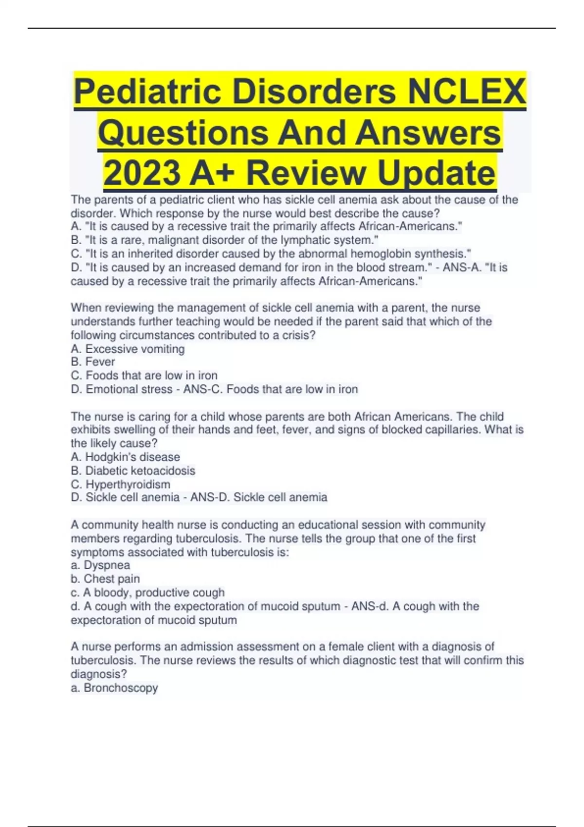 Pediatric Disorders NCLEX Questions And Answers 2023 A+ Review Update The parents of a pediatric client who has sickle cell anemia ask about the cause of the disorder. Which response by the nurse would best describe the cause? A. "It is caused by a recessive trait the primarily affects African-Americans." B. "It is a rare, malignant disorder of the lymphatic system." C. "It is an inherited disorder caused by the abnormal hemoglobin synthesis." D. "It is caused by an increased demand for iron in the blood stream." - ANS-A. "It is caused by a recessive trait the primarily affects African-Americans." When reviewing the management of sickle cell anemia with a parent, the nurse understands further teaching would be needed if the parent said that which of the following circumstances contributed to a crisis? A. Excessive vomiting B. Fever C. Foods that are low in iron D. Emotional stress - ANS-C. Foods that are low in iron The nurse is caring for a child whose parents are both African Americans. The child exhibits swelling of their hands and feet, fever, and signs of blocked capillaries. What is the likely cause? A. Hodgkin's disease B. Diabetic ketoacidosis C. Hyperthyroidism D. Sickle cell anemia - ANS-D. Sickle cell anemia A community health nurse is conducting an educational session with community members regarding tuberculosis. The nurse tells the group that one of the first symptoms associated with tuberculosis is: a. Dyspnea b. Chest pain c. A bloody, productive cough d. A cough with the expectoration of mucoid sputum - ANS-d. A cough with the expectoration of mucoid sputum A nurse performs an admission assessment on a female client with a diagnosis of tuberculosis. The nurse reviews the results of which diagnostic test that will confirm this diagnosis? a. Bronchoscopy b. Sputum culture c. Chest x-ray d. Tuberculin skin test - ANS-b. Sputum culture The parent of a child with TB asks a nurse to explain how the TB is transmitted to others. What is the most appropriate response by the nurse: a. Hand and mouth b. The airborne route c. The fecal-oral route d. Blood and body fluids - ANS-b. The airborne route A 2 year old child is diagnosed with bronchiolitis caused by respiratory syncytial virus (RSV). The child's family also includes an 8 year old child. Which statement is correct? A. RSV isn't highly communicable in infants. B. RSV isn't communicable to older children and adults. C. The 2 year old client must be admitted to the hospital for isolation. D. The children should be separated to prevent the spread of infection. - ANS-D. The children should be separated to prevent the spread of infection. A nurse is preparing for the admission of an infant with a diagnosis of bronchiolitis caused by respiratory syncytial virus (RSV). Which interventions would the nurse include in the plan of care? Select all that apply. 1. Place the infant in a private room. 2. Ensure that the infant's head is in a flexed position. 3. Wear a mask at all times when in contact with the infant. 4. Place the infant in a tent that delivers warm humidified air. 5. Position the infant side-lying, with the head lower than the chest. 6. Ensure that nurses caring for the infant with RSV do not care for other high-risk children. - ANS-1,6 A nurse is caring for a child who has bronchiolitis. Which of the following are appropriate actions for the nurse to take? (Select all that apply). A. Administer oral prednisone B. Initiate chest percussion and postural drainage. C. Administer humidified oxygen D. Suction the nasopharynx as needed E. Administer oral penicillin - ANS-C-humidified oxygen provides moisture to the airway and is an appropriate action for the nurse to take D-Suctioning that nasopharynx will assist the client to clear secretions and is an appropriate action for the nurse to take. The nurse should include which of the following facts when teaching parents about handling a child with recurrent urinary tract infections?... CONTINUES...