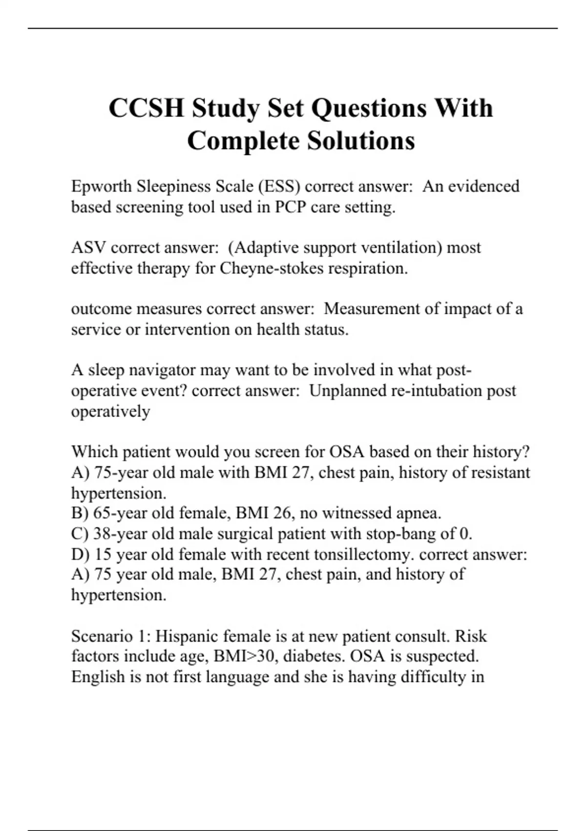 Epworth Sleepiness Scale (ESS) correct answer: An evidenced based screening tool used in PCP care setting. ASV correct answer: (Adaptive support ventilation) most effective therapy for Cheyne-stokes respiration. outcome measures correct answer: Measurement of impact of a service or intervention on health status. A sleep navigator may want to be involved in what post-operative event? correct answer: Unplanned re-intubation post operatively Which patient would you screen for OSA based on their history? A) 75-year old male with BMI 27, chest pain, history of resistant hypertension. B) 65-year old female, BMI 26, no witnessed apnea. C) 38-year old male surgical patient with stop-bang of 0. D) 15 year old female with recent tonsillectomy. correct answer: A) 75 year old male, BMI 27, chest pain, and history of hypertension. Scenario 1: Hispanic female is at new patient consult. Risk factors include age, BMI>30, diabetes. OSA is suspected. English is not first language and she is having difficulty in completing intake forms. What should sleep professional do? correct answer: Offer to assist in completing the forms. At end of visit patient is scheduling for an HST but seems distracted and is fidgeting with her crucifix, b