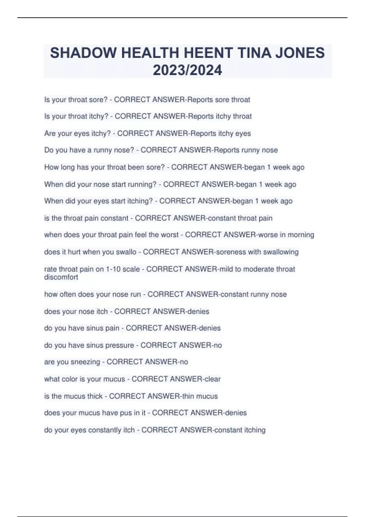 SHADOW HEALTH HEENT TINA JONES 2023/2024 Is your throat sore? - CORRECT ANSWER-Reports sore throat Is your throat itchy? - CORRECT ANSWER-Reports itchy throat Are your eyes itchy? - CORRECT ANSWER-Reports itchy eyes Do you have a runny nose? - CORRECT ANSWER-Reports runny nose How long has your throat been sore? - CORRECT ANSWER-began 1 week ago When did your nose start running? - CORRECT ANSWER-began 1 week ago When did your eyes start itching? - CORRECT ANSWER-began 1 week ago is the throat pain constant - CORRECT ANSWER-constant throat pain when does your throat pain feel the worst - CORRECT ANSWER-worse in morning does it hurt when you swallo - CORRECT ANSWER-soreness with swallowing rate throat pain on 1-10 scale - CORRECT ANSWER-mild to moderate throat discomfort how often does your nose run - CORRECT ANSWER-constant runny nose does your nose itch - CORRECT ANSWER-denies do you have sinus pain - CORRECT ANSWER-denies do you have sinus pressure - CORRECT ANSWER-no are you sneezing - CORRECT ANSWER-no what color is your mucus - CORRECT ANSWER-clear is the mucus thick - CORRECT ANSWER-thin mucus does your mucus have pus in it - CORRECT ANSWER-denies do your eyes constantly itch - CORRECT ANSWER-constant itching are your eyes red - CORRECT ANSWER-reports eye redness have you had changes in your breathing - CORRECT ANSWER-not affected do you have a cough - CORRECT ANSWER-denies do you have chest tightness - CORRECT ANSWER-denies have you been wheezing - CORRECT ANSWER-denies has your asthma worsened - CORRECT ANSWER-denies do you know what is causing your symptoms - CORRECT ANSWER-allergy like symptoms do you think you have a cold - CORRECT ANSWER-no cold symptoms do you think you're having an allergic reaction - CORRECT ANSWER-similar symptoms to sister's hay fever have you treated your eyes with anything - CORRECT ANSWER-denies have you done anything for your runny nose - CORRECT ANSWER-denies have you taken any antihistamines - CORRECT ANSWER-denies have you taken any decongestants - CORRECT ANSWER-denies have you taken anything for your sore throat - CORRECT ANSWER-lozenges as treatment do the lozenges help - CORRECT ANSWER-lozenges reduce symptoms how often do you have a lozenge - CORRECT ANSWER-every few hours does drinking water help - CORRECT ANSWER-water reduces symptoms have you started taking new meds - CORRECT ANSWER-no new meds do you use an inhaler - CORRECT ANSWER-confirms what inhaler do you use - CORRECT ANSWER-albuterol when did you last use your inhaler - CORRECT ANSWER-1 week ago how often do you use your inhaler - CORRECT ANSWER-2 - 3 times per week how many puffs do you use - CORRECT ANSWER-2 - 3 puffs how many puffs are you prescribed - CORRECT ANSWER-2 puffs have you been exposed to any allergens - CORRECT ANSWER-denies cat exposure do you have mold in your house - CORRECT ANSWER-denies mold or mildew do you have dust in your house - CORRECT ANSWER-denies dues are you allergic to anything at work - CORRECT ANSWER-denies exposure to irritants at work how often do you change your bedding - CORRECT ANSWER-once a week have you smoked cigs recently - CORRECT ANSWER-denies history of cig smoking have you been exposed to secondhand smoke - CORRECT ANSWER-denies exposure to secondhand smoke when was your last vision exam - CORRECT ANSWER-childhood when was your last hearing exam - CORRECT ANSWER-childhood when was your last dental visit - CORRECT ANSWER-within the last 2 years how often did you see the dentist when you were a child - CORRECT ANSWERreguarly do you have dental insurance - CORRECT ANSWER-denies do you have vision insurance - CORRECT ANSWER-denies are you allergic to cats - CORRECT ANSWER-confirms are you allergic to dust - CORRECT ANSWER-confirms do you have seasonal allergies - CORRECT ANSWER-denies have you been sick recently - CORRECT ANSWER-denies do you have chills - CORRECT ANSWER-denies do you have fever - CORRECT ANSWER-denies have you felt fatigued - CORRECT ANSWER-low energy level have you felt nauseous - CORRECT ANSWER-denies nausea or vomiting do you ever get headaches - CORRECT ANSWER-occasional headaches do you have a headache currently - CORRECT ANSWER-denies have you ever had a head injury - CORRECT ANSWER-denies do you get lightheadedness - CORRECT ANSWER-denies how often do you have headaches - CORRECT ANSWER-once a week how long do your headaches last - CORRECT ANSWER-few hours how would you describe your headaches - CORRECT ANSWER-tight and throbbing where do you feel your headaches - CORRECT ANSWER-behind her forehead how would you rate your headache on a scale of 1-10 - CORRECT ANSWER-3 or 4 how do you treat your headaches - CORRECT ANSWER-Tylenol what causes your headaches - CORRECT ANSWER-reading and studying do you have blurry vision - CORRECT ANSWER-occasionally has your vision worsened - CORRECT ANSWER-confirms do you have eye pain - CORRECT ANSWER-denies do you have dry eyes - CORRECT ANSWER-denies do you wear contacts - CORRECT ANSWER-denies can you describe your blurry vision - CORRECT ANSWER-fuzzy letters when do you get blurry vision - CORRECT ANSWER-when reading for long periods how long have you been reading when your vision gets blurry - CORRECT ANSWERafter 2+ hours of reading do you get headaches when you have blurry vision - CORRECT ANSWER-coincide have you had ear problems - CORRECT ANSWER-denies have you had hearing changes - CORRECT ANSWER-denies do you have ear pain - CORRECT ANSWER-denies do you have ear discharge - CORRECT ANSWER-denies do you have a change in your sense of smell - CORRECT ANSWER-denies have you had any nasal or sinus surgeries - CORRECT ANSWER-denies have you had any nosebleeds - CORRECT ANSWER-denies have you had problems with your mouth - CORRECT ANSWER-denies Has your sense of taste changed? - CORRECT ANSWER-denies have you had dry mouth recently - CORRECT ANSWER-denies have you had any oral surgeries - CORRECT ANSWER-denies do you have mouth pain - CORRECT ANSWER-denies do you have mouth sores