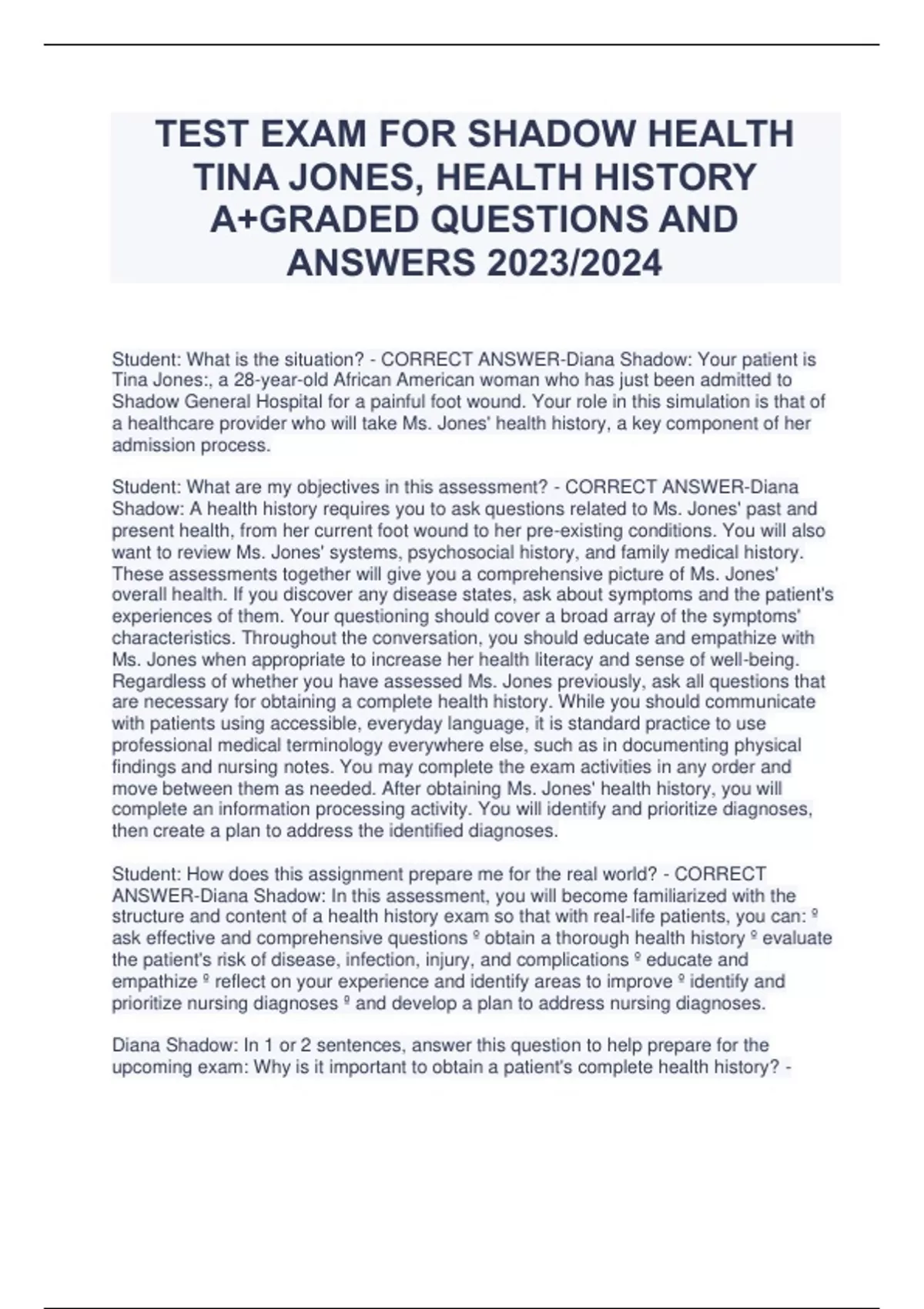 TEST EXAM FOR SHADOW HEALTH TINA JONES, HEALTH HISTORY A+GRADED QUESTIONS AND ANSWERS 2023/2024 Student: What is the situation? - CORRECT ANSWER-Diana Shadow: Your patient is Tina Jones:, a 28-year-old African American woman who has just been admitted to Shadow General Hospital for a painful foot wound. Your role in this simulation is that of a healthcare provider who will take Ms. Jones' health history, a key component of her admission process. Student: What are my objectives in this assessment? - CORRECT ANSWER-Diana Shadow: A health history requires you to ask questions related to Ms. Jones' past and present health, from her current foot wound to her pre-existing conditions. You will also want to review Ms. Jones' systems, psychosocial history, and family medical history. These assessments together will give you a comprehensive picture of Ms. Jones' overall health. If you discover any disease states, ask about symptoms and the patient's experiences of them. Your questioning should cover a broad array of the symptoms' characteristics. Throughout the conversation, you should educate and empathize with Ms. Jones when appropriate to increase her health literacy and sense of well-being. Regardless of whether you have assessed Ms. Jones previously, ask all questions that are necessary for obtaining a complete health history. While you should communicate with patients using accessible, everyday language, it is standard practice to use professional medical terminology everywhere else, such as in documenting physical findings and nursing notes. You may complete the exam activities in any order and move between them as needed. After obtaining Ms. Jones' health history, you will complete an information processing activity. You will identify and prioritize diagnoses, then create a plan to address the identified diagnoses. Student: How does this assignment prepare me for the real world? - CORRECT ANSWER-Diana Shadow: In this assessment, you will become familiarized with the structure and content of a health history exam so that with real-life patients, you can: º ask effective and comprehensive questions º obtain a thorough health history º evaluate the patient's risk of disease, infection, injury, and complications º educate and empathize º reflect on your experience and identify areas to improve º identify and prioritize nursing diagnoses º and develop a plan to address nursing diagnoses. Diana Shadow: In 1 or 2 sentences, answer this question to help prepare for the upcoming exam: Why is it important to obtain a patient's complete health history? - CORRECT ANSWER-Student: So that you understand if there are any problems related to their chief complaint. Also, to help treat their current condition. Patient Exam - Vital Signs: - CORRECT ANSWER-Height: 170 cm, Weight: 90 kg, BMI: 31, Random blood glucose: 238, Temperature: 102.4° F, Blood pressure: 138/90 mmHg, Heart rate: 90, Respiratory rate: 18, O2 sat: 98% Patient Exam - Interview: - CORRECT ANSWERStudent: Hello, my name is Catlain, I am your nurse today. - CORRECT ANSWER-Tina Jones: Hey. Student: Can you confirm your name? - CORRECT ANSWER-Tina Jones: Tina Jones:. Student: Why did you come in today? - CORRECT ANSWER-Tina Jones: I got this scrape on my foot a while ago, and it got really infected. It's killing me. Student: What additional symptoms have you experienced? - CORRECT ANSWERTina Jones: I mean, it's all red and swollen, and there's pus, it feels hot, it hurts like hell... It's got all that going on. Student: Can you rate your current pain level on a scale of 0 to 10? - CORRECT ANSWER-Tina Jones: ...Like a 7. It hurts a lot, but whatever pain med the ER gave me is helping a little bit. Student: Please describe the pain. - CORRECT ANSWER-Tina Jones: It's throbbing and like, sharp if I try to put weight on it. Student: How did you hurt your foot? - CORRECT ANSWER-Tina Jones: I was changing a light bulb, and I had to use our little stepstool to reach it. My foot slid off the bottom step and it got all scraped up. I didn't realize how sharp the edge was! Student: Has your foot been draining any liquids? - CORRECT ANSWER-Tina Jones: Yeah, there's definitely pus. Student: What color was the pus? - CORRECT ANSWER-Tina Jones: It's... white or maybe off-white. Student: How have you treated the wound? - CORRECT ANSWER-Tina Jones: I've been taking Advil for my foot for a few days. Student: What did you do to treat your foot after your accident? - CORRECT ANSWERTina Jones: I made sure to clean it and keep it bandaged. And I put Neosporin on it. Student: How effective was the Neosporin? - CORRECT ANSWER-Tina Jones: Well, I'm here, so I guess it didn't do its job. Student: Can you walk with your foot being injured? - CORRECT ANSWER-Tina Jones: No, I can't. I can't put any weight on it without like, shooting pain. Student: What preexisting medical conditions do you have? - CORRECT ANSWERTina Jones: I mean, I have asthma and diabetes, but right I now I just care about my foot! Student: I understand your foot hurts, but I need to know this information to make sure I take care of the problem correctly. - CORRECT ANSWER-Tina Jones: Thanks. Student: When were you diagnosed with diabetes? - CORRECT ANSWER-Tina Jones: I was diagnosed when I was 24. Student: What do you do to manage your asthma? - CORRECT ANSWER-Tina Jones: I try to avoid things that give me breathing problems, but when my asthma starts to act up, I just use my inhaler. Student: What medications did you take for your diabetes? - CORRECT ANSWER-Tina Jones: It was metformin. Student: Do you currently take medicine for your diabetes? - CORRECT ANSWER-Tina Jones: No, I don't take anything for my diabetes anymore. Student: What made you stop taking medication for your diabetes? - CORRECT ANSWER-Tina Jones: I guess I just got sick of feeling sick and gassy all the time, and it was overwhelming, remembering to take pills and check my sugar. I feel a lot better now that I'm just eating heal