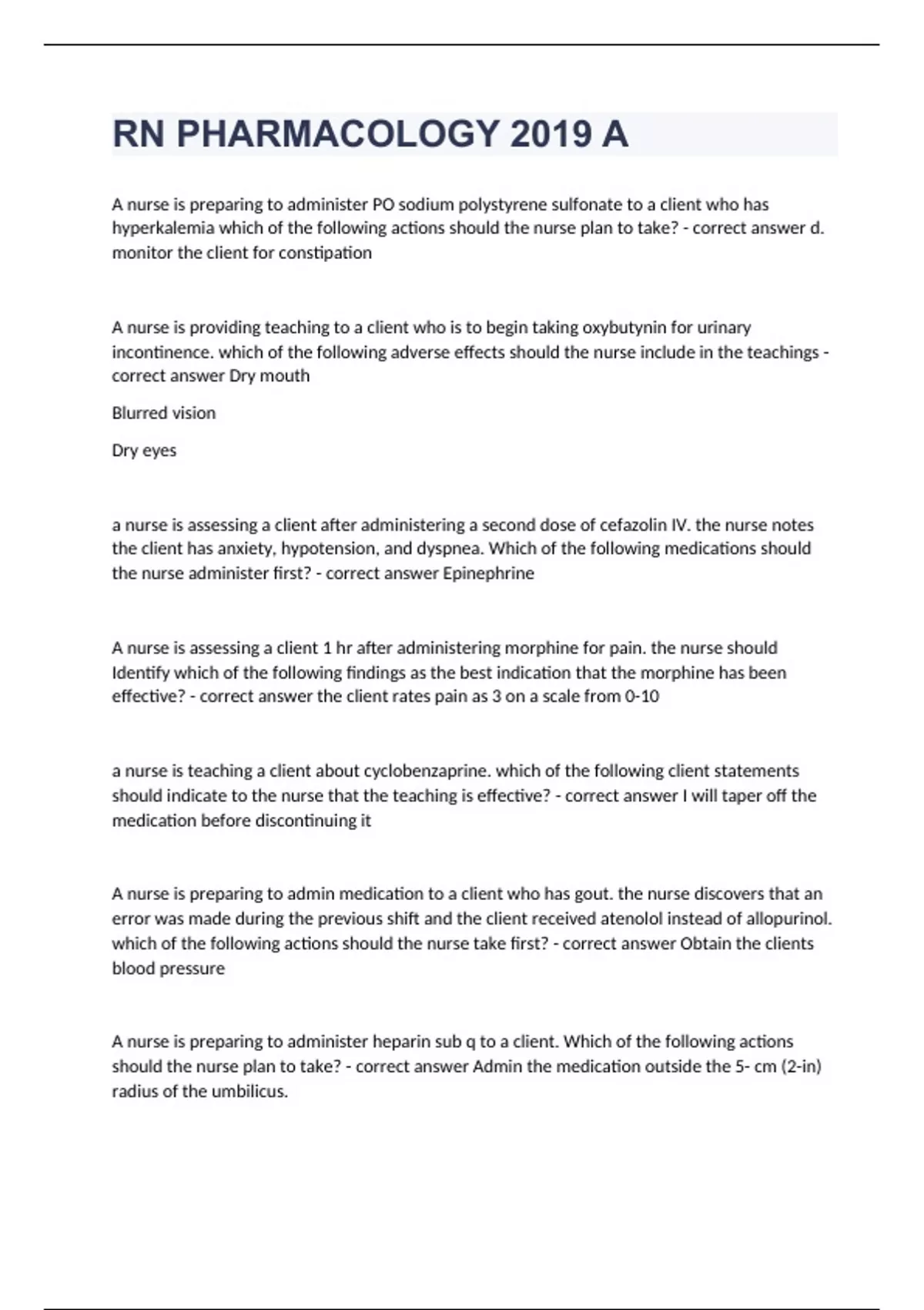 A nurse is preparing to administer PO sodium polystyrene sulfonate to a client who has hyperkalemia which of the following actions should the nurse plan to take? - correct answer d. monitor the client for constipation A nurse is providing teaching to a client who is to begin taking oxybutynin for urinary incontinence. which of the following adverse effects should the nurse include in the teachings - correct answer Dry mouth Blurred vision Dry eyes a nurse is assessing a client after administering a second dose of cefazolin IV. the nurse notes the client has anxiety, hypotension, and dyspnea. Which of the following medications should the nurse administer first? - correct answer Epinephrine A nurse is assessing a client 1 hr after administering morphine for pain. the nurse should Identify which of the following findings as the best indication that the morphine has been effective? - correct answer the client rates pain as 3 on a scale from 0-10 a nurse is teaching a client about cyclobenzaprine. which of the following client statements should indicate to the nurse that the teaching is effective? - correct answer I will taper off the medication before discontinuing it A nurse is preparing to admin medication to a client who has gout. the nurse discovers that an error was made during the previous shift and the client received atenolol instead of allopurinol. which of the following actions should the nurse take first? - correct answer Obtain the clients blood pressure A nurse is preparing to administer heparin sub q to a client. Which of the following actions should the nurse plan to take? - correct answer Admin the medication outside the 5- cm (2-in) radius of the umbilicus. A nurse is teaching a client who is to begin taking tamoxifen for the treatment of breast cancer. Which of the following adverse effects should the nurse include in the teaching? - correct answer Hot flashes A nurse is reviewing the laboratory results of a client who is taking digoxin for heart failure. which of the following results should the nurse report to the provider? - correct answer Potassium level 2.5 mEq/L A nurse is providing teaching to a client who has peptic ulcer disease and is to start a new prescription for sucralfate. which of the following actions of sucralfate should the nurse include in the teaching? - correct answer Forms a protective barrier over ulcers A nurse is assessing a client who has myasthenia graves and is taking neostigmine. which of the following finings should indicate to the nurse that the client is experiencing an adverse effect? - correct answer Miosis A nurse is preparing to administer Ciprofloxacin 15 mg/kg PO every 12 hr to a child who weighs 44 lb. how many mg should the nurse administer per dose? - correct answer 300 mg A nurse on the acute care unit is caring for a client who is receiving gentamicin IV. the nurse should report which of the following findings to the provider as and AE of the medication - correct answer Tinnitus A nurse is teaching a group of unit nurses about medication reconciliation. which of the following information should the nurse include in the teaching? - correct answer A transition in care requires the nurse to conduct medication reconciliation. a nurse is caring for a client who is experiencing acute alcohol withdrawal. for which of the following client outcomes would the nurse admin chlordiazepoxide - correct answer Prevent delirium tremens A nurse is reviewing the lab results for a client who is receiving heparin via continuous IV infusion for DVT. the nurse should discontinue the medication infusion for which of the following client findings? - correct answer Platelets 96,000/mm3 A nurse admins a dose of metformin to a client instead of prescribed dose of metoclopramide. which of the following actions should the nurse take first? - correct answer Check the clients Blood glucose A nurse in an emergency department is caring for a client who has myasthenia graves and is in a cholinergic crisis. which of the following medications should the nurse plan to admin? - correct answer Atropine A nurse is caring for a client who is receiving filgrastim. which of the following findings should the nurse document to indicate the effectiveness of the therapy? - correct answer Increased Neutrophil count A nurse in an emergency department is caring for a client who has heroin toxicity. the client is unresponsive with pinpoint pupils and a RR of 6/ min. which of the following medications should the nurse plan to admin? - correct answer Naloxone A nurse is providing teaching to a client who has a prescription for ergotamine sublingual to treat migraine headaches. which of the following information should the nurse include in the instructions? - correct answer Take one tablet at onset of migraine A nurse is teaching a client about the use of risedronate for the treatment of osteoporosis. The nurse should ID which of the following statements as an indication that the client understands the teaching? - correct answer I should sit up for 30 min after taking the risedronate a nurse is collecting a medication history from a client who has a new prescription for lithium. the nurse should ID that the client should discontinue which of the following over the counter medications? - correct answer Ibuprofen A nurse is planning for a care client who is prescribed metoclopramide following bowel surgery. for which of the following AE should the nurse monitor? - correct answer Sedation A nurse is caring for a client who is taking acetazolamide for chronic open angle glaucoma. for which of the following AE should the nurse instruct the client to monitor and report? - correct answer Tingling of the fingers A nurse is planning care for a client who has hypertension and is to start taking metoprolol. which of the following interventions should the nurse include in the plan of care? - correct answer Determine apical pulse prior to admin A nurse in an Emergency department is caring for a cl