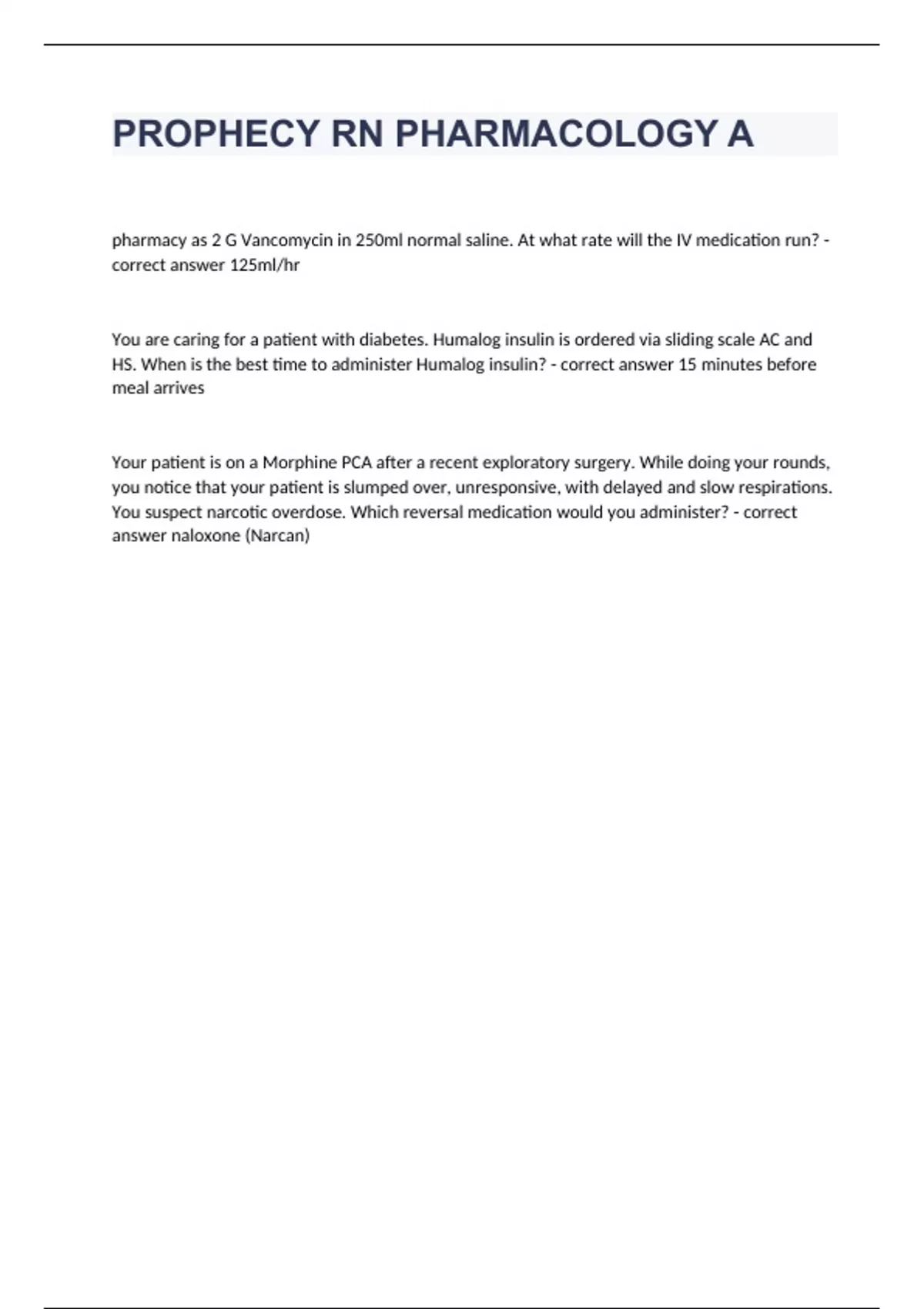 pharmacy as 2 G Vancomycin in 250ml normal saline. At what rate will the IV medication run? - correct answer 125ml/hr You are caring for a patient with diabetes. Humalog insulin is ordered via sliding scale AC and HS. When is the best time to administer Humalog insulin? - correct answer 15 minutes before meal arrives Your patient is on a Morphine PCA after a recent exploratory surgery. While doing your rounds, you notice that your patient is slumped over, unresponsive, with delayed and slow respirations. You suspect narcotic overdose. Which reversal medication would you administer? - correct answer naloxone (Narcan)