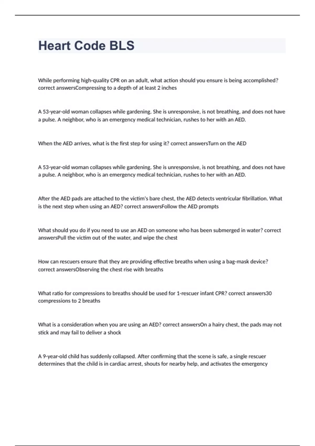 While performing high-quality CPR on an adult, what action should you ensure is being accomplished? correct answersCompressing to a depth of at least 2 inches A 53-year-old woman collapses while gardening. She is unresponsive, is not breathing, and does not have a pulse. A neighbor, who is an emergency medical technician, rushes to her with an AED. When the AED arrives, what is the first step for using it? correct answersTurn on the AED A 53-year-old woman collapses while gardening. She is unresponsive, is not breathing, and does not have a pulse. A neighbor, who is an emergency medical technician, rushes to her with an AED. After the AED pads are attached to the victim's bare chest, the AED detects ventricular fibrillation. What is the next step when using an AED? correct answersFollow the AED prompts What should you do if you need to use an AED on someone who has been submerged in water? correct answersPull the victim out of the water, and wipe the chest How can rescuers ensure that they are providing effective breaths when using a bag-mask device? correct answersObserving the chest rise with breaths What ratio for compressions to breaths should be used for 1-rescuer infant CPR? correct answers30 compressions to 2 breaths What is a consideration when you are using an AED? correct answersOn a hairy chest, the pads may not stick and may fail to deliver a shock A 9-year-old child has suddenly collapsed. After confirming that the scene is safe, a single rescuer determines that the child is in cardiac arrest, shouts for nearby help, and activates the emergency