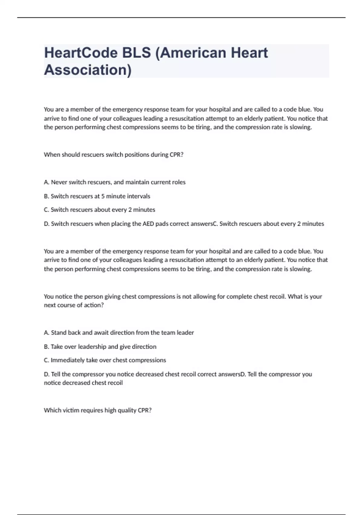 You are a member of the emergency response team for your hospital and are called to a code blue. You arrive to find one of your colleagues leading a resuscitation attempt to an elderly patient. You notice that the person performing chest compressions seems to be tiring, and the compression rate is slowing. When should rescuers switch positions during CPR? A. Never switch rescuers, and maintain current roles B. Switch rescuers at 5 minute intervals C. Switch rescuers about every 2 minutes D. Switch rescuers when placing the AED pads correct answersC. Switch rescuers about every 2 minutes You are a member of the emergency response team for your hospital and are called to a code blue. You arrive to find one of your colleagues leading a resuscitation attempt to an elderly patient. You notice that the person performing chest compressions seems to be tiring, and the compression rate is slowing. You notice the person giving chest compressions is not allowing for complete chest recoil. What is your next course of action? A. Stand back and await direction from the team leader B. Take over leadership and give direction C. Immediately take over chest compressions D. Tell the compressor you notice decreased chest recoil correct answersD. Tell the compressor you notice decreased chest recoil Which victim requires high quality CPR?