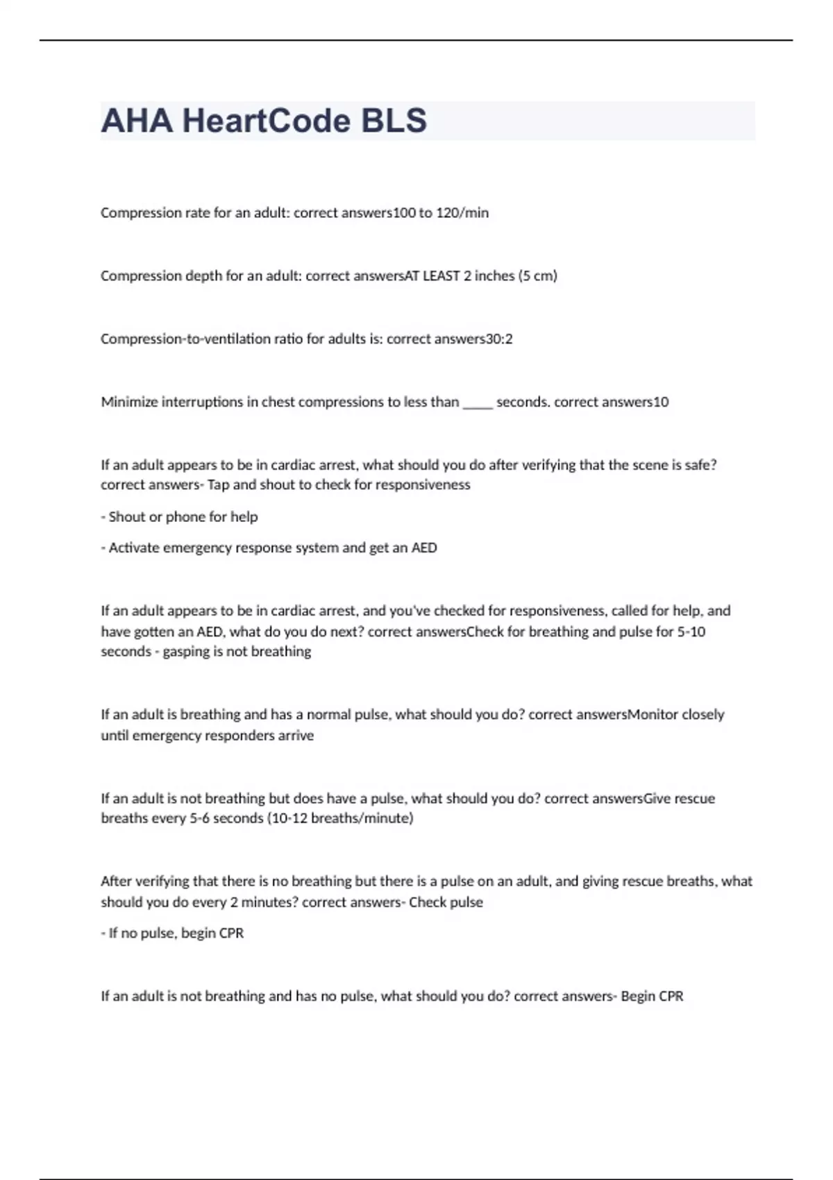Compression rate for an adult: correct answers100 to 120/min Compression depth for an adult: correct answersAT LEAST 2 inches (5 cm) Compression-to-ventilation ratio for adults is: correct answers30:2 Minimize interruptions in chest compressions to less than ____ seconds. correct answers10 If an adult appears to be in cardiac arrest, what should you do after verifying that the scene is safe? correct answers- Tap and shout to check for responsiveness - Shout or phone for help - Activate emergency response system and get an AED If an adult appears to be in cardiac arrest, and you've checked for responsiveness, called for help, and have gotten an AED, what do you do next? correct answersCheck for breathing and pulse for 5-10 seconds - gasping is not breathing If an adult is breathing and has a normal pulse, what should you do? correct answersMonitor closely until emergency responders arrive If an adult is not breathing but does have a pulse, what should you do? correct answersGive rescue breaths every 5-6 seconds (10-12 breaths/minute) After verifying that there is no breathing but there is a pulse on an adult, and giving rescue breaths, what should you do every 2 minutes? correct answers- Check pulse - If no pulse, begin CPR If an adult is not breathing and has no pulse, what should you do? correct answers- Begin CPR