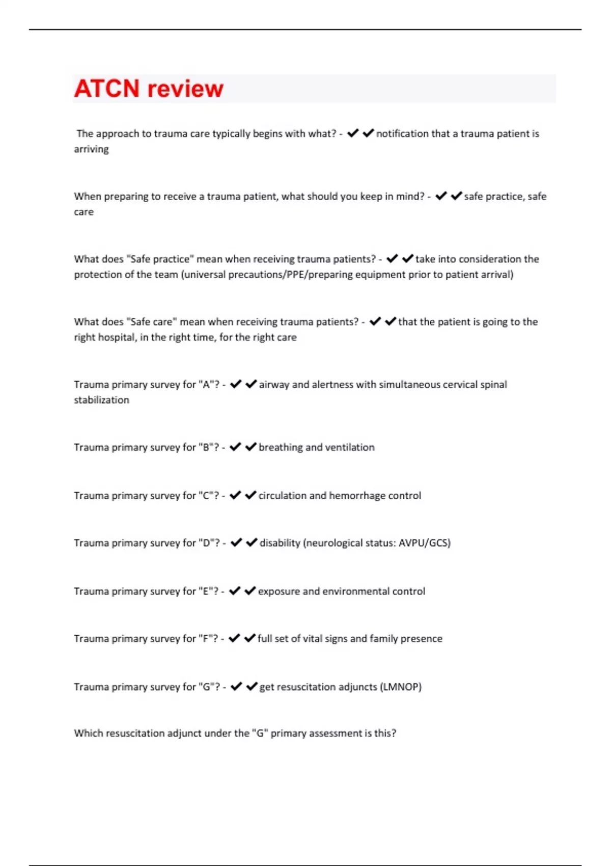 The approach to trauma care typically begins with what? - notification that a trauma patient is arriving When preparing to receive a trauma patient, what should you keep in mind? - safe practice, safe care What does "Safe practice" mean when receiving trauma patients? - take into consideration the protection of the team (universal precautions/PPE/preparing equipment prior to patient arrival) What does "Safe care" mean when receiving trauma patients? - that the patient is going to the right hospital, in the right time, for the right care Trauma primary survey for "A"? - airway and alertness with simultaneous cervical spinal stabilization Trauma primary survey for "B"? - breathing and ventilation Trauma primary survey for "C"? - circulation and hemorrhage control Trauma primary survey for "D"? - disability (neurological status: AVPU/GCS) Trauma primary survey for "E"? - exposure and environmental control Trauma primary survey for "F"? - full set of vital signs and family presence Trauma primary survey for "G"? - get resuscitation adjuncts (LMNOP) Which resuscitation adjunct under the "G" primary assessment is this?-"L" - laboratory studies (ABG's/Type and cross)