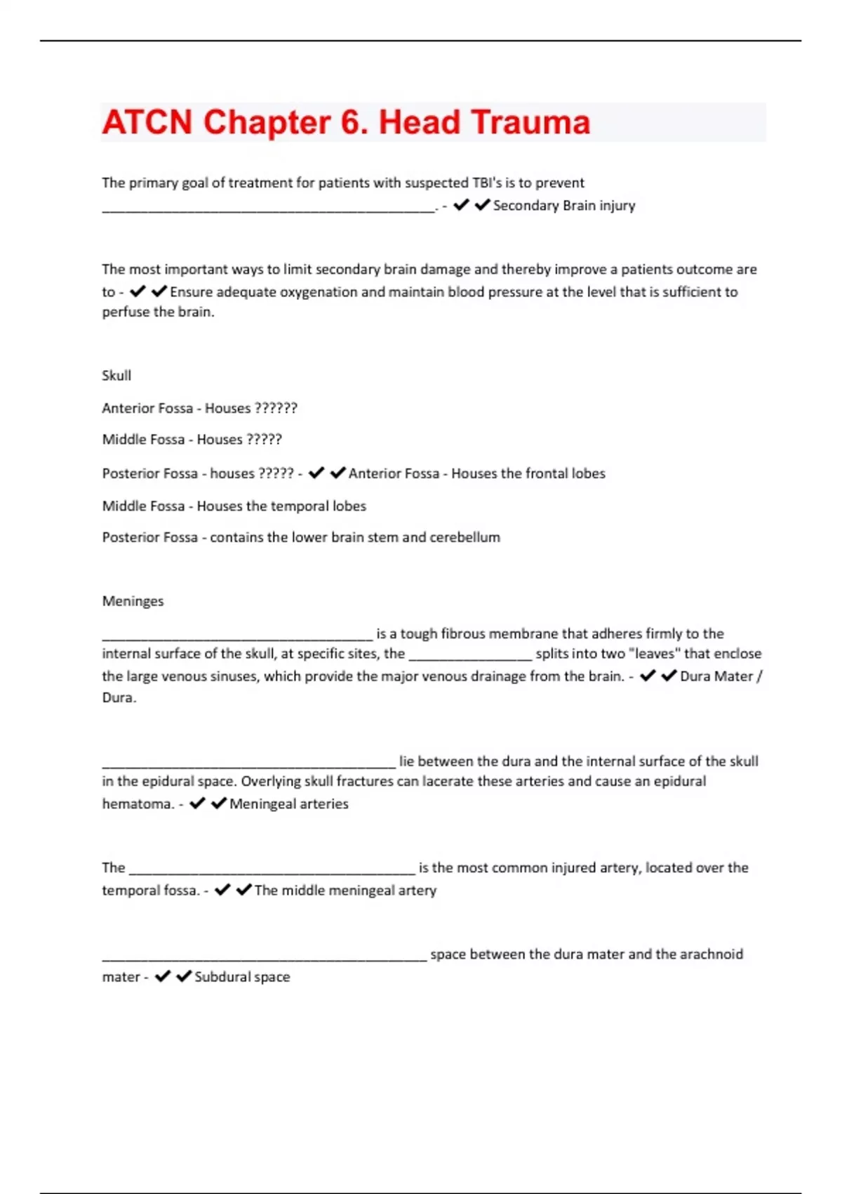 The primary goal of treatment for patients with suspected TBI's is to prevent ___________________________________________. - Secondary Brain injury The most important ways to limit secondary brain damage and thereby improve a patients outcome are to - Ensure adequate oxygenation and maintain blood pressure at the level that is sufficient to perfuse the brain. Skull Anterior Fossa - Houses ?????? Middle Fossa - Houses ????? Posterior Fossa - houses ????? - Anterior Fossa - Houses the frontal lobes Middle Fossa - Houses the temporal lobes Posterior Fossa - contains the lower brain stem and cerebellum Meninges ___________________________________ is a tough fibrous membrane that adheres firmly to the internal surface of the skull, at specific sites, the ________________ splits into two "leaves" that enclose the large venous sinuses, which provide the major venous drainage from the brain. - Dura Mater / Dura. ______________________________________ lie between the dura and the internal surface of the skull in the epidural space. Overlying skull fractures can lacerate these arteries and cause an epidural hematoma. - Meningeal arteries The _____________________________________ is the most common injured artery, located over the temporal fossa. - The middle meningeal artery __________________________________________ space between the dura mater and the arachnoid mater - Subdural spaceBeneath the dura is a second meningeal layer: the thin, transparent arachnoid mater. Because the dura is not attached to the underlying arachnoid membranes a potential space between these layers exists (the subdural space) into which hemorrhage can occur. - In a Brian injury, bridging veins that travel from the surface of the brain to the venous sinuses within the dura may tear, leading to the formation of a subdural hematoma. ______________________________________ is firmly attached to the surface of the brain. Cerebral spinal fluid fills the space between the watertight arachnoid mater and the pia mater. (Subarachnoid space) Hemorrhage into this fluid filled space frequently accompanies brain contusion and injuries to major blood vessels at the base of the brain. - Pia Mater