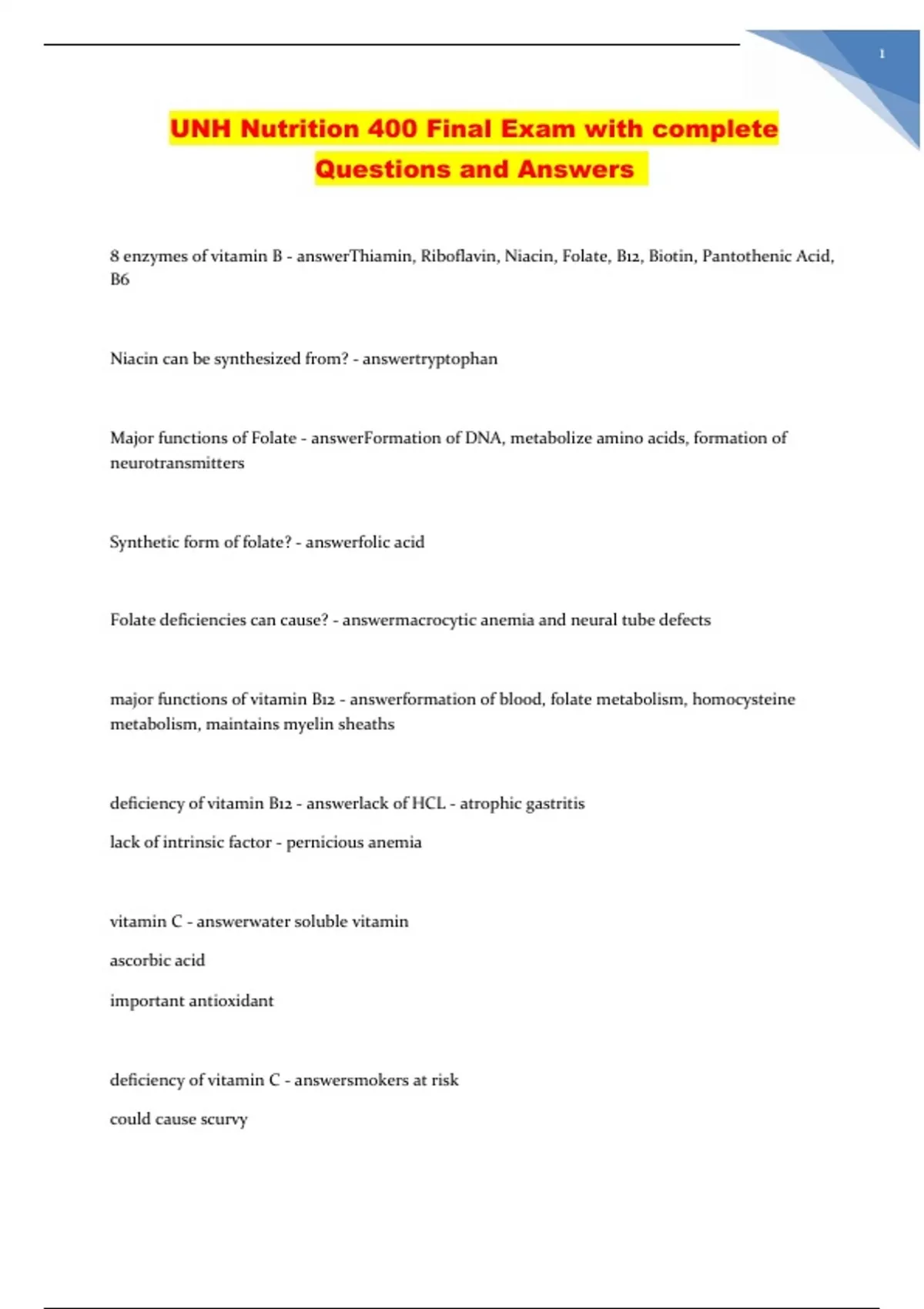 UNH Nutrition 400 Final Exam with complete Questions and Answers UNH Nutrition 400 Final Exam with complete Questions and Answers UNH Nutrition 400 Final Exam with complete Questions and Answers