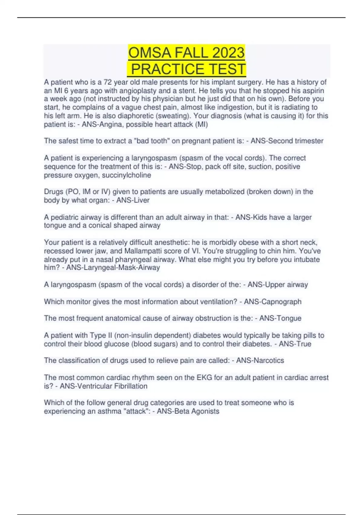 OMSA FALL 2023 PRACTICE TEST A patient who is a 72 year old male presents for his implant surgery. He has a history of an MI 6 years ago with angioplasty and a stent. He tells you that he stopped his aspirin a week ago (not instructed by his physician but he just did that on his own). Before you start, he complains of a vague chest pain, almost like indigestion, but it is radiating to his left arm. He is also diaphoretic (sweating). Your diagnosis (what is causing it) for this patient is: - ANS-Angina, possible heart attack (MI) The safest time to extract a "bad tooth" on pregnant patient is: - ANS-Second trimester A patient is experiencing a laryngospasm (spasm of the vocal cords). The correct sequence for the treatment of this is: - ANS-Stop, pack off site, suction, positive pressure oxygen, succinylcholine Drugs (PO, IM or IV) given to patients are usually metabolized (broken down) in the body by what organ: - ANS-Liver A pediatric airway is different than an adult airway in that: - ANS-Kids have a larger tongue and a conical shaped airway Your patient is a relatively difficult anesthetic: he is morbidly obese with a short neck, recessed lower jaw, and Mallampatti score of VI. You're struggling to chin him. You've already put in a nasal pharyngeal airway. What else might you try before you intubate him? - ANS-Laryngeal-Mask-Airway A laryngospasm (spasm of the vocal cords) a disorder of the: - ANS-Upper airway Which monitor gives the most information about ventilation? - ANS-Capnograph The most frequent anatomical cause of airway obstruction is the: - ANS-Tongue A patient with Type II (non-insulin dependent) diabetes would typically be taking pills to control their blood glucose (blood sugars) and to control their diabetes. - ANS-True The classification of drugs used to relieve pain are called: - ANS-Narcotics The most common cardiac rhythm seen on the EKG for an adult patient in cardiac arrest is? -ANS- A patient has taken 20 mg of Prednisone (steroid) daily for over 30 years due to her rheumatoid arthritis. Your doctor is planning to remove a difficult deeply impacted wisdom tooth. Our preoperative concern for this patient is: - ANS-This patient will not be able to handle a "flight or fight" response from a stressful procedure A patient with Type I Diabetes (insulin dependent) would typically be giving themselves shots (injections) of insulin to control their blood glucose (blood sugars) and to control their diabetes. - ANS-True Constriction of or narrowing of the coronary arteries can lead to Angina (chest pain). - ANS-True Your doctor has started an IV. You are hooking the IV line and bag of IV fluids to the catheter. Which bag of IV fluids is the preferred for routine healthy patients? - ANS-LR A patient says that she is "Allergic to Amoxicillin and Codeine". Upon further questioning, she says that she had a rash when she took Penicillin and gets really nauseated when she takes Tylenol with Codeine. This patient has: - ANS-An allergy to Amoxicillin and has an adverse reaction to Codeine Asthma is a disease of the lungs. It is specifically considered a disease of the: - ANSLower airway, bronchiolar constriction A contraindication to the use of Diprovan (Propofol) include: - ANS-Allergy to eggs The doctor asks you to assess the patient's ventilation. The things you look at include watching the rise and fall of the chest and looking at the: - ANS-Oxygen Saturation and End tidal CO2 (capnograph) The two types of diabetes that are classically characterized as the following: - ANSType I is insulin dependent and Type II non-insulin dependent A patient with Type I diabetes (insulin dependent) calls the morning of surgery. She states that she is going to go to "sleep" to have a bad tooth removed. She is aware that she needs to have nothing to eat or drink prior to coming in but she is not sure what to do with her insulin. She asks for instructions on her insulin that she normally injects herself with in the morning. You advise her to: - Continues...