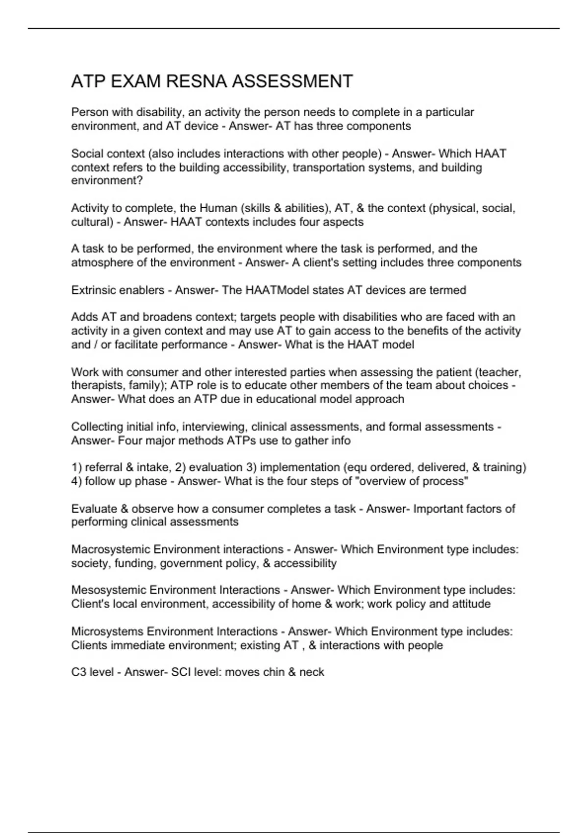 Person with disability, an activity the person needs to complete in a particular environment, and AT device - Answer- AT has three components Social context (also includes interactions with other people) - Answer- Which HAAT context refers to the building accessibility, transportation systems, and building environment? Activity to complete, the Human (skills & abilities), AT, & the context (physical, social, cultural) - Answer- HAAT contexts includes four aspects A task to be performed, the environment where the task is performed, and the atmosphere of the environment - Answer- A client's setting includes three components Extrinsic enablers - Answer- The HAATModel states AT devices are termed Adds AT and broadens context; targets people with disabilities who are faced with an activity in a given context and may use AT to gain access to the benefits of the activity and / or facilitate performance - Answer- What is the HAAT model Work with consumer and other interested parties when assessing the patient (teacher, therapists, family); ATP role is to educate other members of the team about choices - Answer- What does an ATP due in educational model approach Collecting initial info, interviewing, clinical assessments, and formal assessments - Answer- Four major methods ATPs use to gather info 1) referral & intake, 2) evaluation 3) implementation (equ ordered, delivered, & training) 4) follow up phase - Answer- What is the four steps of "overview of process" Evaluate & observe how a consumer completes a task - Answer- Important factors of performing clinical assessments Macrosystemic Environment interactions - Answer- Which Environment type includes: society, funding, government policy, & accessibility Mesosystemic Environment Interactions - Answer- Which Environment type includes: Client's local environment, accessibility of home & work; work policy and attitude Microsystems Environment Interactions - Answer- Which Environment type includes: Cli