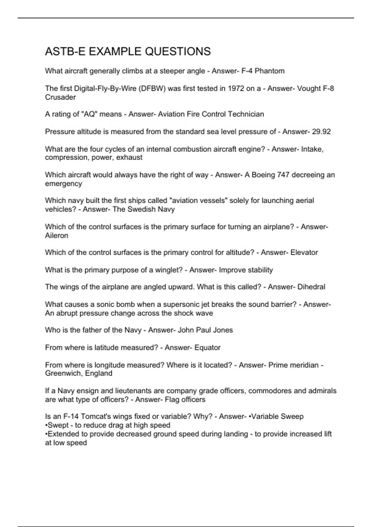 What aircraft generally climbs at a steeper angle - Answer- F-4 Phantom The first Digital-Fly-By-Wire (DFBW) was first tested in 1972 on a - Answer- Vought F-8 Crusader A rating of "AQ" means - Answer- Aviation Fire Control Technician Pressure altitude is measured from the standard sea level pressure of - Answer- 29.92 What are the four cycles of an internal combustion aircraft engine? - Answer- Intake, compression, power, exhaust Which aircraft would always have the right of way - Answer- A Boeing 747 decreeing an emergency Which navy built the first ships called "aviation vessels" solely for launching aerial vehicles? - Answer- The Swedish Navy Which of the control surfaces is the primary surface for turning an airplane? - Answer- Aileron Which of the control surfaces is the primary control for altitude? - Answer- Elevator What is the primary purpose of a winglet? - Answer- Improve stability The wings of the airplane are angled upward. What is this called? - Answer- Dihedral What causes a sonic bomb when a supersonic jet breaks the sound barrier? - Answer- An abrupt pressure change across the shock wave Who is the father of the Navy - Answer- John Paul Jones From where is latitude measured? - Answer- Equator From where is longitude measured? Where is it located? - Answer- Prime meridian - Greenwich, England If a Navy ensign and lieutenants are company grade officers, commodores and admirals are what type of officers? - Answer- Flag officers Is an F-14 Tomcat's wings fixed or variable? Why? - Answer- •Variable Sweep
