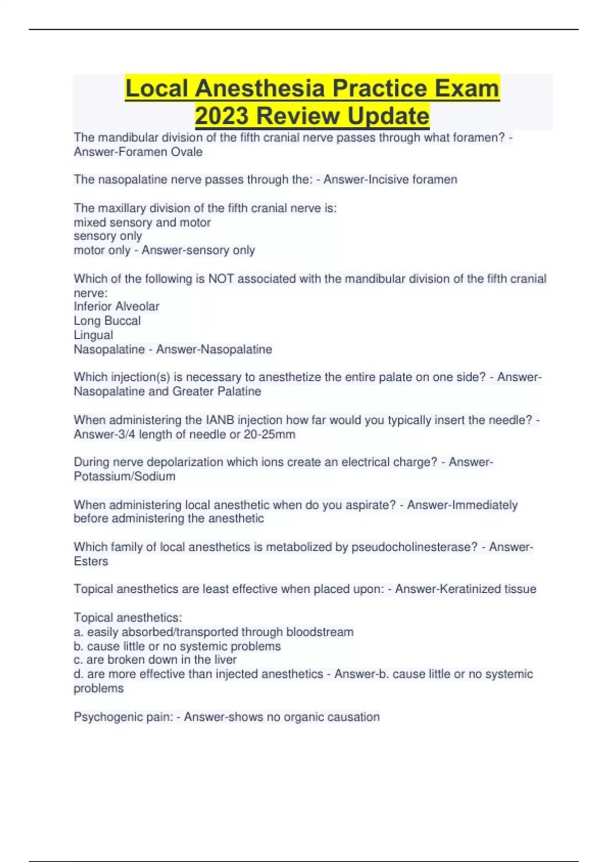 Local Anesthesia Practice Exam 2023 Review Update The mandibular division of the fifth cranial nerve passes through what foramen? - Answer-Foramen Ovale The nasopalatine nerve passes through the: - Answer-Incisive foramen The maxillary division of the fifth cranial nerve is: mixed sensory and motor sensory only motor only - Answer-sensory only Which of the following is NOT associated with the mandibular division of the fifth cranial nerve: Inferior Alveolar Long Buccal Lingual Nasopalatine - Answer-Nasopalatine Which injection(s) is necessary to anesthetize the entire palate on one side? - AnswerNasopalatine and Greater Palatine When administering the IANB injection how far would you typically insert the needle? - Answer-3/4 length of needle or 20-25mm During nerve depolarization which ions create an electrical charge? - AnswerPotassium/Sodium When administering local anesthetic when do you aspirate? - Answer-Immediately before administering the anesthetic Which family of local anesthetics is metabolized by pseudocholinesterase? - AnswerEsters Topical anesthetics are least effective when placed upon: - Answer-Keratinized tissue Topical anesthetics: a. easily absorbed/transported through bloodstream b. cause little or no systemic problems c. are broken down in the liver d. are more effective than injected anesthetics - Answer-b. cause little or no systemic problems Psychogenic pain: - Answer-shows no organic causation What is the maximum dose of epi for a cardiac patient? - Answer-0.04mg If a local complication of hemotoma occurs what treatment should be taken? - AnswerImmediate application of cold to the area and pressure application to the affected area. Hematoma is most likely to occur when needle enters the : - Answer-pterygoid plexus Which compound is used as an antioxidant with in the cartridge? - Answer-Sodium bisulfite Vassopressors added to local anesthetic solutions: - Answer-reduce bleeding prolong the action of the local anesthetic reduce toxicity by slow absorption Burning sensations upon injection can be attributed to: - Answer-pH of solution injection administered too fast Cartridge wiped with alcohol prior to administration Needle breakage occurs most frequently due to: - Answer-patient movement bent needle A myelinated nerve: - Answer-allows faster conduction of impulses Which area may not be anesthetized by PSA Block? - Answer-mesiobuccal root of the maxillary 1st molar A patient with liver and kidney disease: - Answer- Continues...