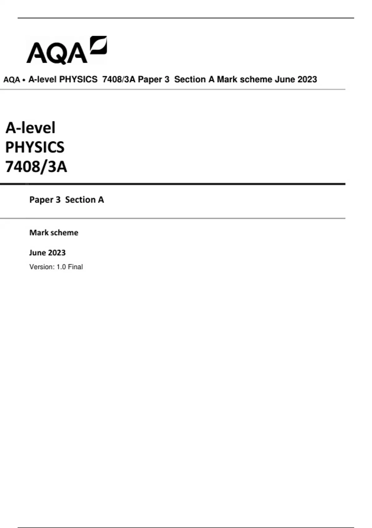 AQA • A-level PHYSICS 7408/3A Paper 3 Section A Mark scheme June 2023