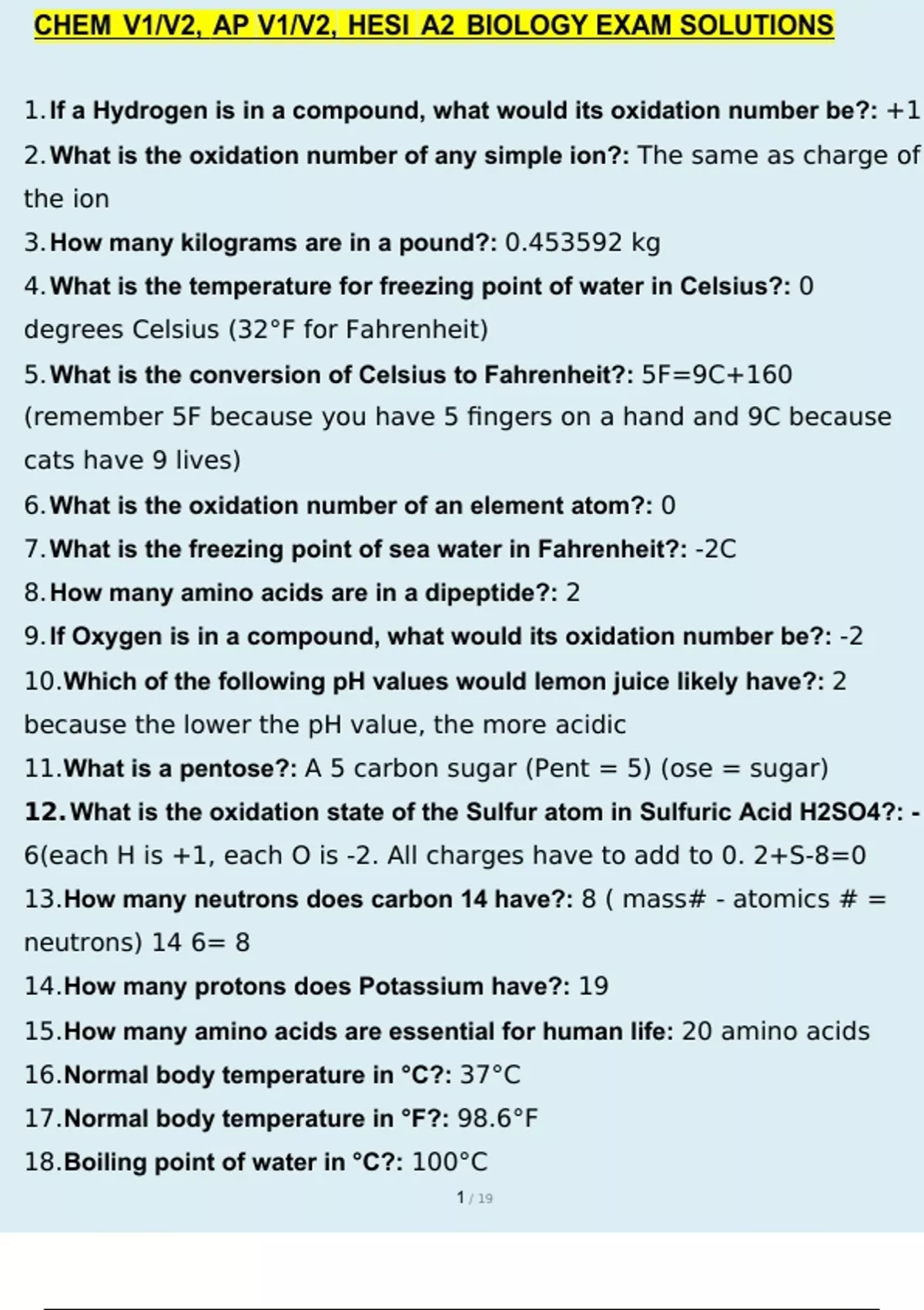 CHEM V1 V2, AP V1 V2, HESI A2 BIOLOGY EXAM SOLUTIONS QUESTIONS AND ANSWERS GRADED A+