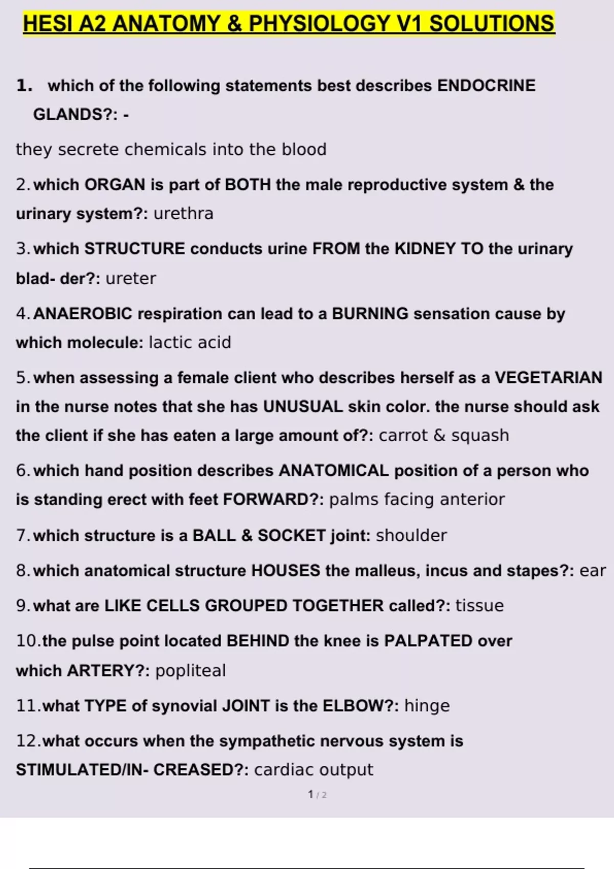 HESI A2 ANATOMY & PHYSIOLOGY V1 SOLUTIONS QUESTIONS AND ANSWERS GRADED A+