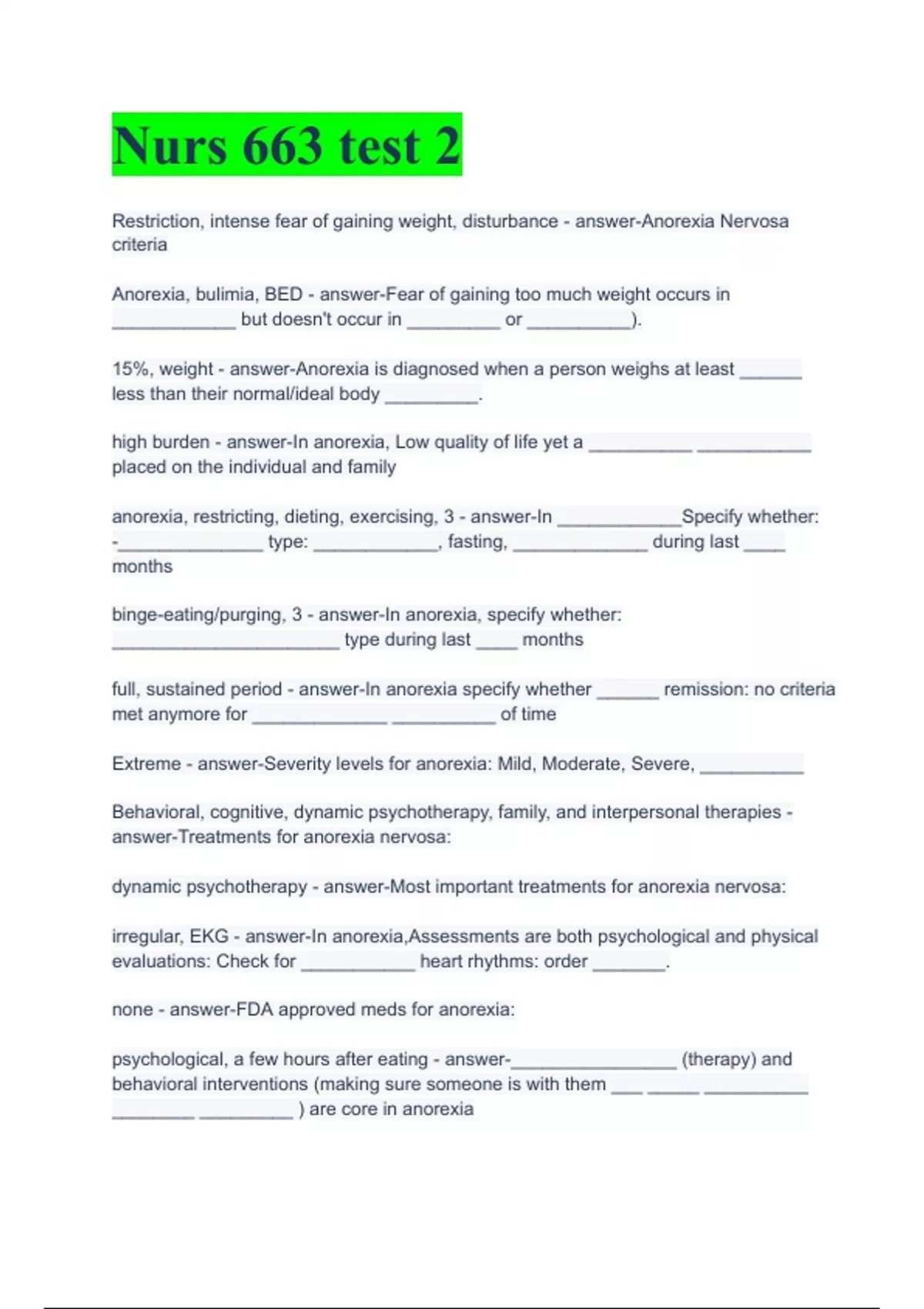 Nurs 663 test 2 questions with correct answers Restriction, intense fear of gaining weight, disturbance - answer-Anorexia Nervosa criteria Anorexia, bulimia, BED - answer-Fear of gaining too much weight occurs in ____________ but doesn't occur in _________ or __________). 15%, weight - answer-Anorexia is diagnosed when a person weighs at least ______ less than their normal/ideal body _________. high burden - answer-In anorexia, Low quality of life yet a __________ ___________ placed on the individual and family anorexia, restricting, dieting, exercising, 3 - answer-In ____________Specify whether: -______________ type: ____________, fasting, _____________ during last ____ months