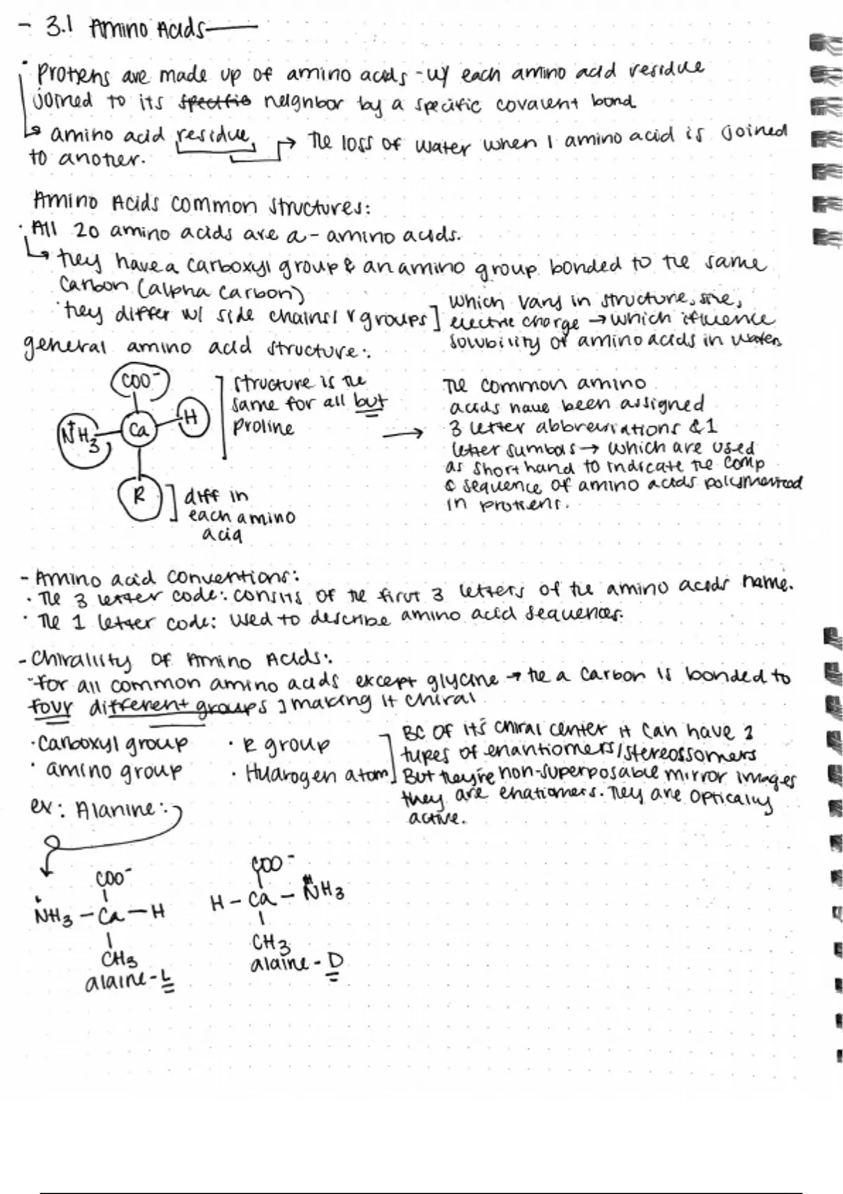 This document goes over the different types of amino acids, their R groups, and the formation and bonds of such. It also goes over the thermodynamic relations and favorability of breaking and forming these bonds. This document also goes into how to find Isoelectric points, and the translations of such.
