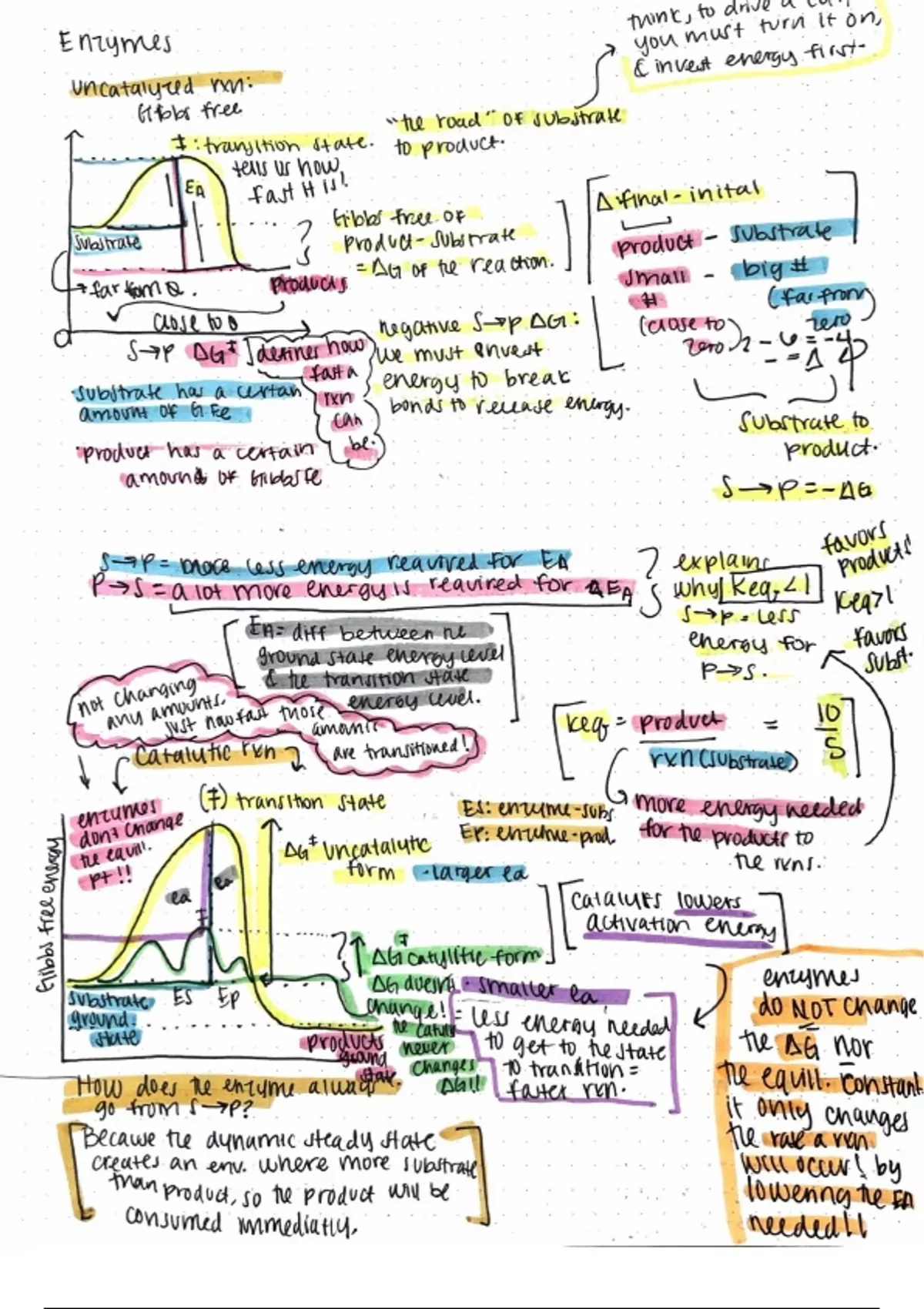 This document goes over the function of enzymes and the parts that go into enzyme functions. It describes the part of an enzyme like active sites, substrates, products, and the thermodynamic activities between them. It shows what enzymes can and cannot do, and what relationship enzymes have versus a non-enzymatic relationship. It shows the change graphically and what can change, versus what it cannot change and why it can’t