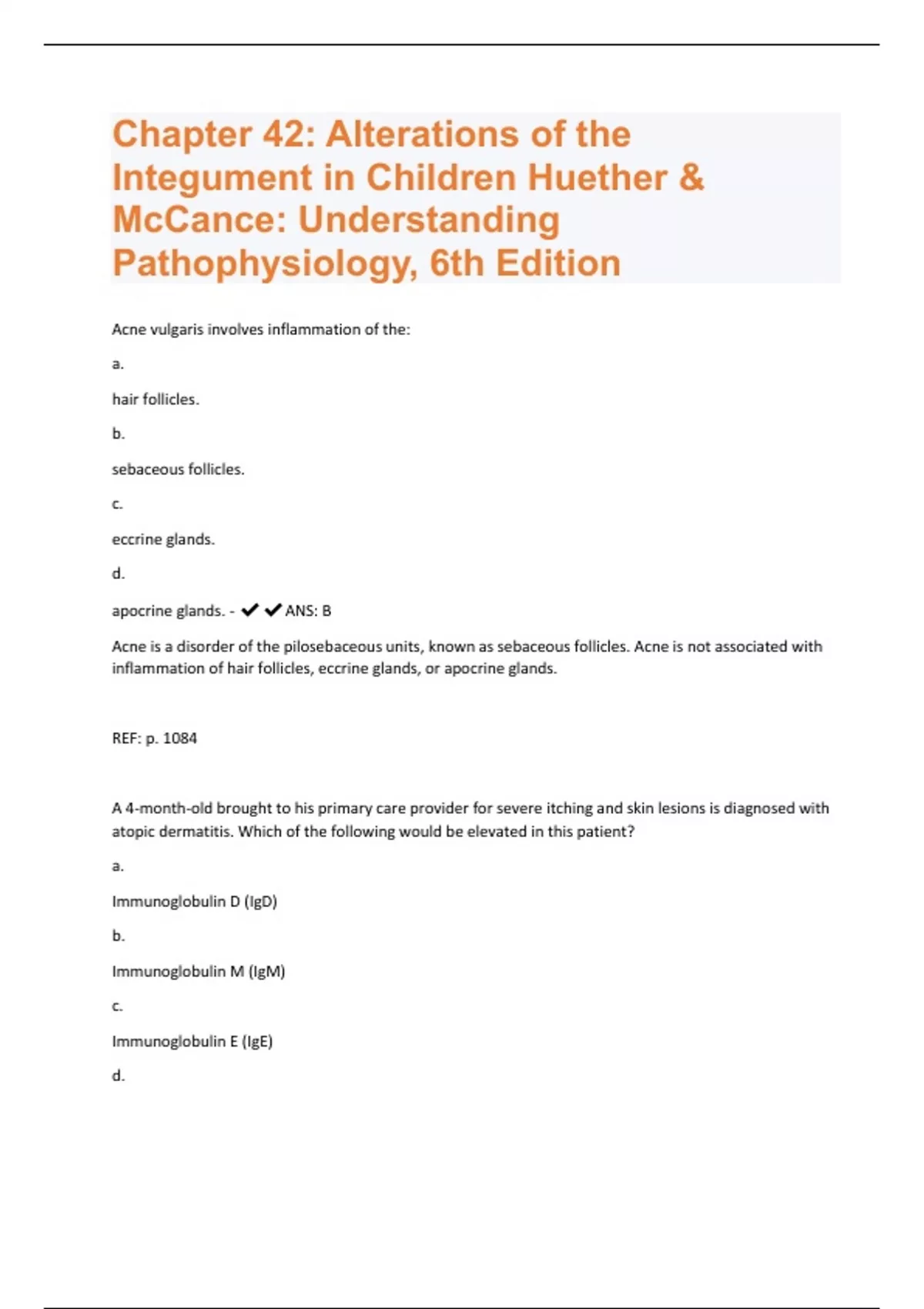 Acne vulgaris involves inflammation of the: a. hair follicles. b. sebaceous follicles. c. eccrine glands. d. apocrine glands. - ANS: B Acne is a disorder of the pilosebaceous units, known as sebaceous follicles. Acne is not associated with inflammation of hair follicles, eccrine glands, or apocrine glands. REF: p. 1084 A 4-month-old brought to his primary care provider for severe itching and skin lesions is diagnosed with atopic dermatitis. Which of the following would be elevated in this patient? a. Immunoglobulin D (IgD) b. Immunoglobulin M (IgM) c. Immunoglobulin E (IgE) d.Immunoglobulin G (IgG) - ANS: C Most individuals affected with atopic dermatitis show an increased serum IgE level. Neither IgD, IgM, nor IgG would be elevated. REF: p. 1085 A 4-month-old is diagnosed with atopic dermatitis (AD). Which assessment finding will most likely support this diagnosis? a. Blistering b. Moist reddened skin c. Dry, itchy skin d. White patches - ANS: C AD has a constellation of clinical features that include dry, sensitive, itchy, and easily irritated skin because the barrier function of the skin is impaired. Blistering, moist skin is not associated with AD. White patches are characteristic of other disorders, such as measles. REF: p. 1085 A 14-year-old presents with severe acne. Which of the following promotes acne development? a. Androgens b. Estrogens c. Gonadotropins d.Glucocorticoids - ANS: A Androgens, not estrogens, increase the size and productivity of the sebaceous glands and promote P. acnes. Neither gonadotropins nor glucocorticoids increase the size and productivity of the sebaceous glands and promote P. acnes. REF: p. 1084 Bullous impetigo is caused by a strain of: a. Staphylococcus aureus. b. Molluscum contagiosum. c. Escherichia coli. d. Candida albicans. - ANS: A