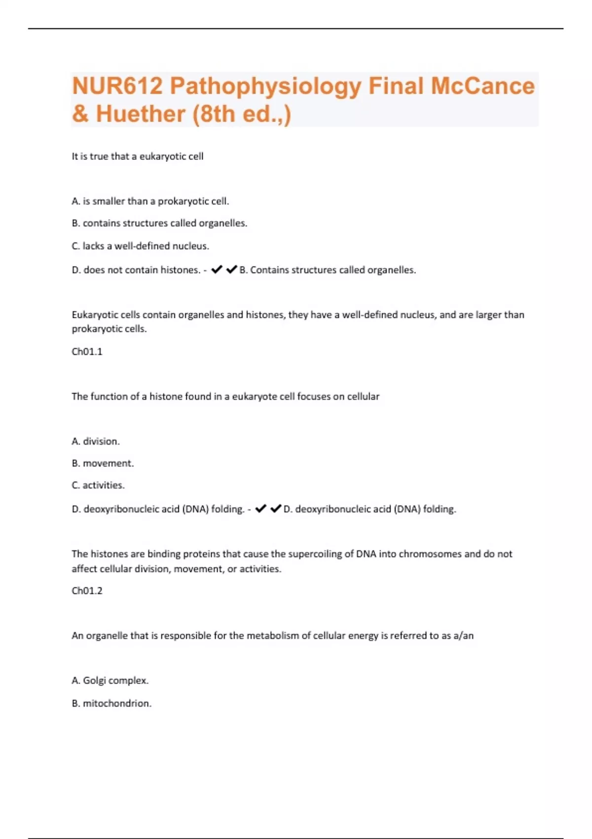 It is true that a eukaryotic cell A. is smaller than a prokaryotic cell. B. contains structures called organelles. C. lacks a well-defined nucleus. D. does not contain histones. - B. Contains structures called organelles. Eukaryotic cells contain organelles and histones, they have a well-defined nucleus, and are larger than prokaryotic cells. Ch01.1 The function of a histone found in a eukaryote cell focuses on cellular A. division. B. movement. C. activities. D. deoxyribonucleic acid (DNA) folding. - D. deoxyribonucleic acid (DNA) folding. The histones are binding proteins that cause the supercoiling of DNA into chromosomes and do not affect cellular division, movement, or activities. Ch01.2 An organelle that is responsible for the metabolism of cellular energy is referred to as a/an A. Golgi complex. B. mitochondrion.C. endoplasmic reticulum. D. nucleolus. - B. mitochondrion Mitochondria play a role in cellular metabolism, cellular respiration, and energy production. The Golgi complex is responsible for processing and packaging proteins from the endoplasmic reticulum, where they are synthesized. The nucleolus is a small, dense structure that contains the ribonucleic acid (RNA), DNA, and DNA-binding proteins. Ch01.3 Which statement best describes a desmosome? A. A desmosome is a barrier to diffusion. B. Desmosomes hold cells together by continuous bands. C. A desmosome is a communicating tunnel. D. Desmosomes function as a zona occludens. - B. Desmosomes hold cells together by continuous bands. The desmosome is a type of cell junction. The other two types include tight junctions and gap junctions. Desmosomes hold cells together by forming a continuous band of epithelial tissue or belt (or buttonlike) points of contact. They are also a source of structural stability. Tight junctions serve as barriers to diffusion and prevent the movement of substances through transport proteins. Gap junctions are clusters of communicating tunnels. Ch01.4 Which statement describes the function of a second messenger? A. Binds with membrane-bound receptors via a ligand B. Triggers a cascade of intracellular events C. Opens specific channels in the cell membrane D. Blocks a membrane-bound receptor signal - B. Triggers a cascade of intracellular eventsThe binding of a ligand to a cell surface receptor triggers the activation of intracellular second messengers. Second messengers activate signal transduction pathways in the cell that can initiate different intracellular events. Cyclic adenosine monophosphate (cAMP) and calcium (Ca++) are the two major second-messenger pathways. First messengers are the extracellular ligands that bind to cell surface receptors. Binding of first messengers can result in the opening or closing of specific cell membrane channels or the activation of second messengers. Ch01.5 Which statement is correct regarding cellular energy? A. Glycolysis is the building of sugar molecules. B. Oxidative cellular metabolism is a single reaction making adenosine triphosphate (ATP). C. Oxidative phosphorylation occurs in the mitochondria. D. Anaerobic glycolysis occurs in the presence of oxygen. - C. Oxidative phosphorylation occurs in the mitochondria. Oxidative phosphorylation occurs in the mitochondria. This is the mechanism by which the energy produced from carbohydrates, fats, and proteins is transferred to ATP. Glycolysis is a process that breaks down glucose molecules; it produces a net of two ATP molecules. Oxidation is a process during which a pair of electrons are removed and transferred. Oxidative cellular metabolism involves 10 biochemical reactions. Anaerobic glycolysis occurs in the absence of oxygen. Aerobic means in the presence of oxygen. Ch01.6 Movement of a solute molecule from an area of high concentration to an area of low concentration is called A. diffusion. B. filtration. C. osmosis. D. hydrostatic pressure. - A. diffusion.