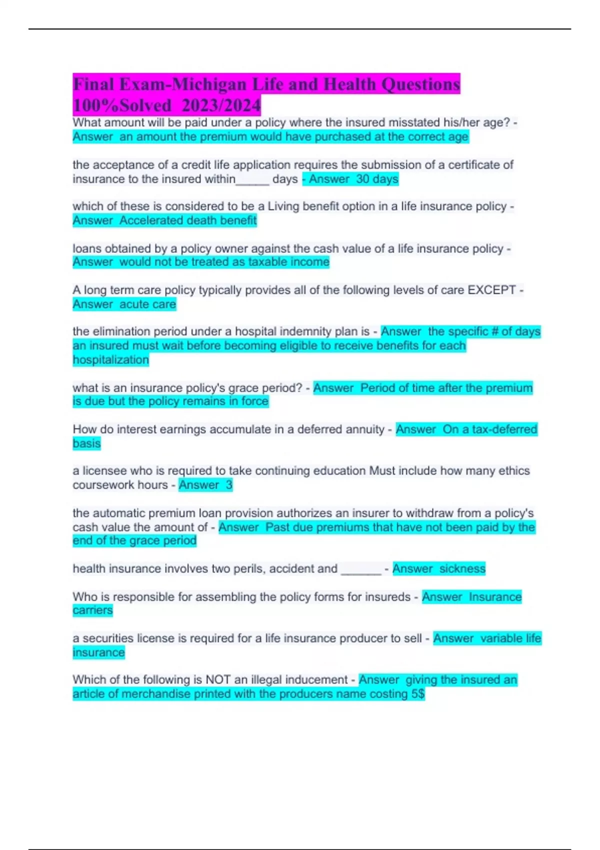Final Exam-Michigan Life and Health Questions 100%Solved 2023/2024