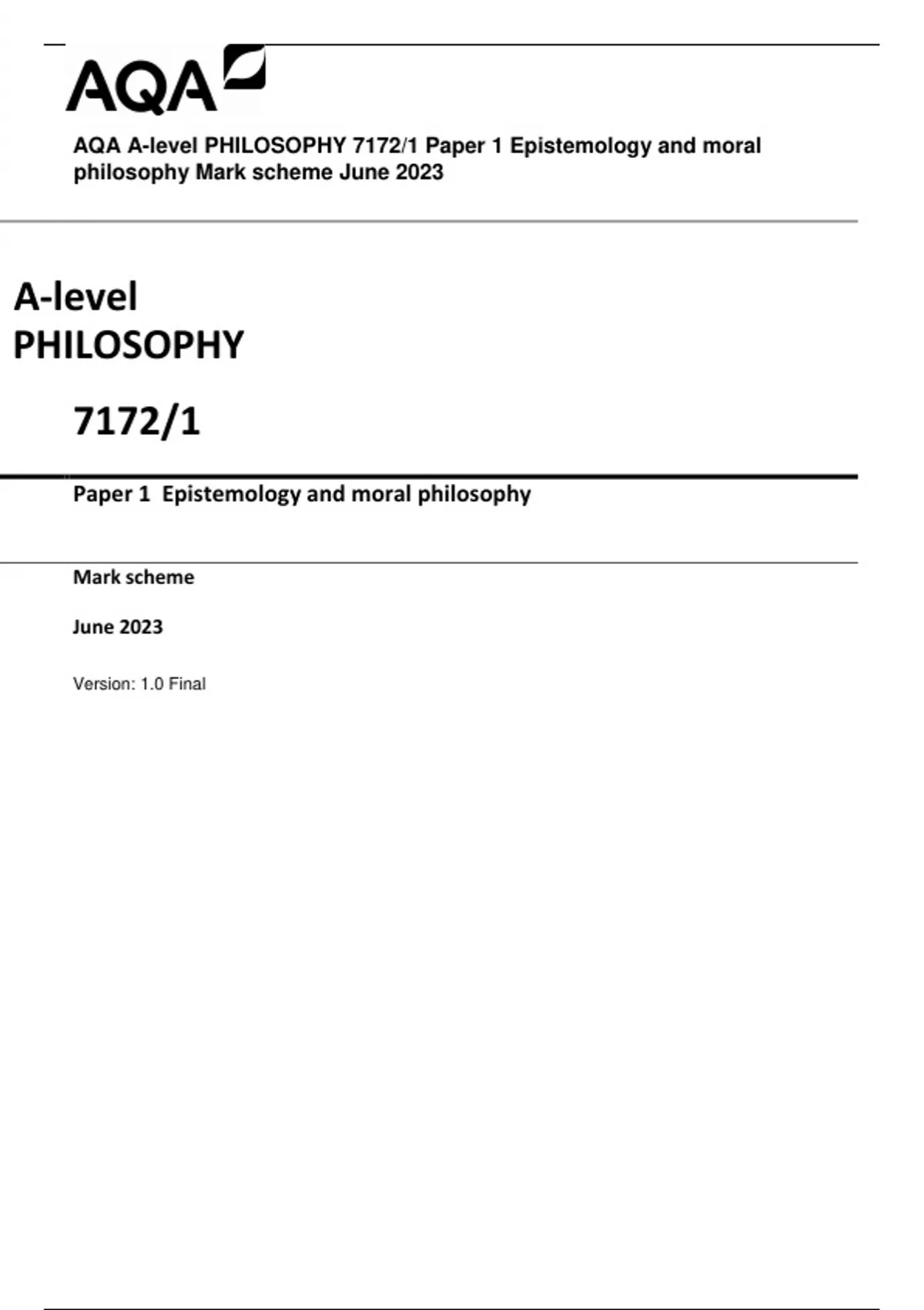AQA A-level PHILOSOPHY 7172/1 Paper 1 Epistemology and moral philosophy Mark scheme June 2023
