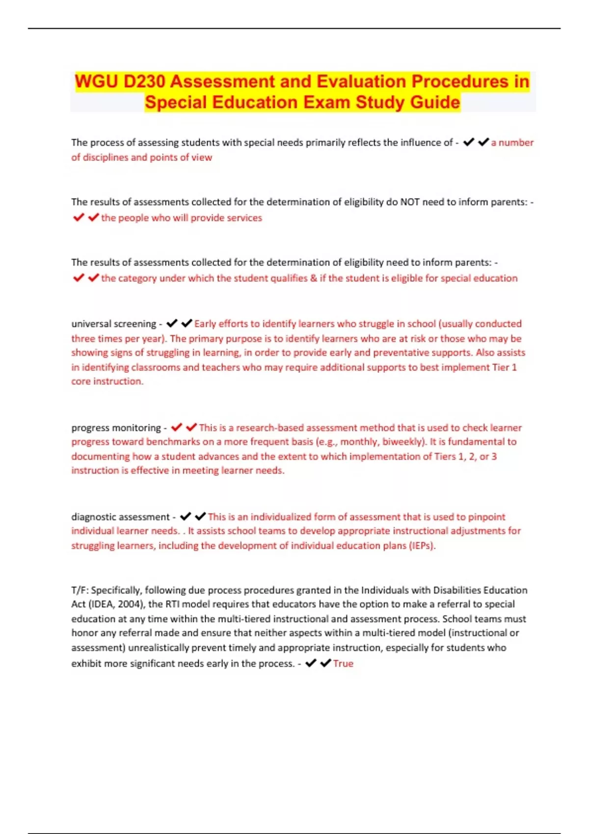 WGU D230 Assessment and Evaluation Procedures in Special Education Exam Study Guide | Latest 2023/24 | Updated & Verified | Guaranteed Success | 32 Pages