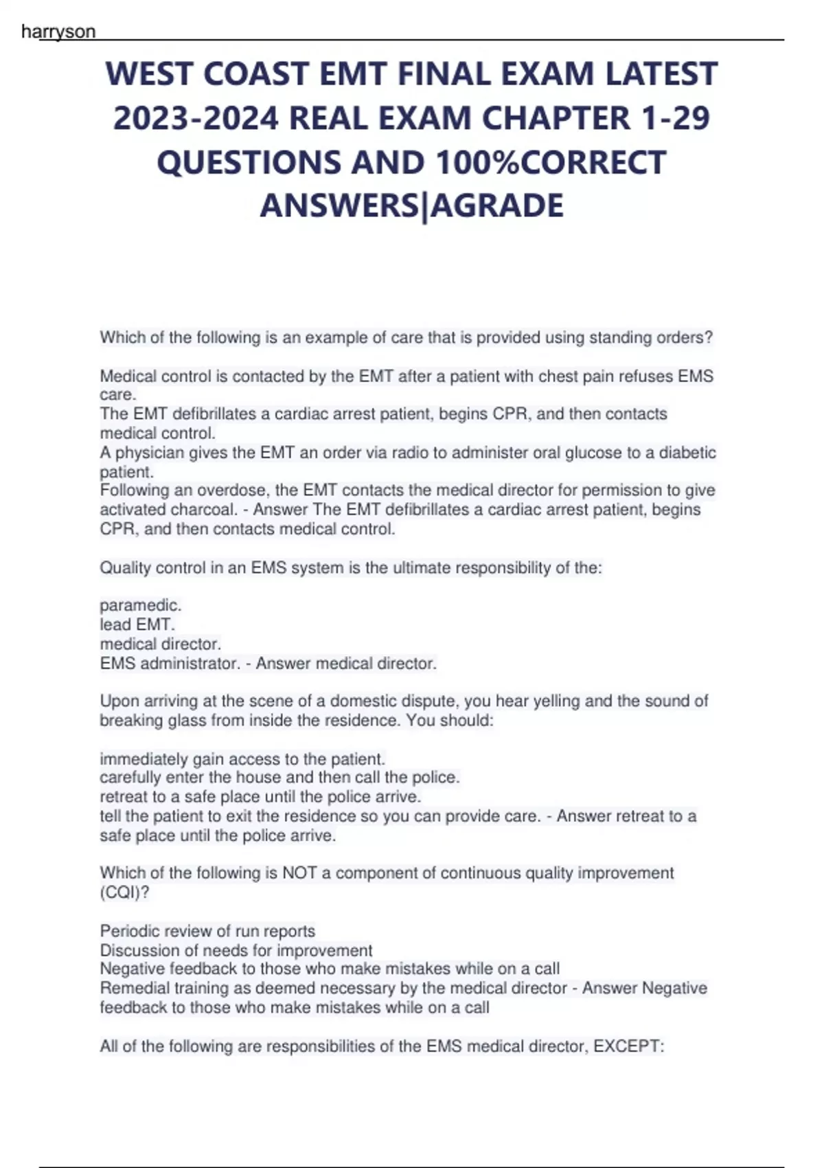 West coast emt final exam latest real exam chapter 1 29questions and 100 WEST COAST EMT FINAL EXAM LATEST REAL EXAM CHAPTER 1-29 QUESTIONS AND 100%CORRECT ANSWERS|AGRADE Which of the following is an example of care that is provided using standing orders? Medical control is contacted by the EMT after a patient with chest pain refuses EMS care. The EMT defibrillates a cardiac arrest patient, begins CPR, and then contacts medical control. A physician gives the EMT an order via radio to administer oral glucose to a diabetic patient. Following an overdose, the EMT contacts the medical director for permission to give activated charcoal. - Answer The EMT defibrillates a cardiac arrest patient, begins CPR, and then contacts medical control. Quality control in an EMS system is the ultimate responsibility of the: paramedic. lead EMT. medical director. EMS administrator. - Answer medical director. Upon arriving at the scene of a domestic dispute, you hear yelling and the sound of breaking glass from inside the residence. You should: immediately gain access to the patient. carefully enter the house and then call the police. retreat to a safe place until the police arrive. tell the patient to exit the residence so you can provide care. - Answer retreat to a safe place until the police arrive. Which of the following is NOT a component of continuous quality improvement (CQI)? Periodic review of run reports Discussion of needs for improvement Negative feedback to those who make mistakes while on a call Remedial training as deemed necessary by the medical director - Answer Negative feedback to those who make mistakes while on a call All of the following are responsibilities of the EMS medical director, EXCEPT: harryson WEST COAST EMT FINAL EXAM LATEST REAL EXAM CHAPTER 1-29 QUESTIONS AND 100%CORRECT ANSWERS|AGRADE evaluating patient insurance information. serving as liaison with the medical community. ensuring that the appropriate standards are met by EMTs. ensuring appropriate EMT education and continuing training. - Answer evaluating patient insurance information. Which of the following situations would MOST likely disqualify a person for EMS certification? A misdemeanor at the age of 17 Driving under the influence of alcohol Possessing a valid driver's license from another state A mild hearing impairment that is corrected with hearing aids - Answer Driving under the influence of alcohol Which of the following should be the EMT's highest priority? Controlling severe bleeding Maintaining a patient's airway Ensuring patient safety Ensuring personal safety - Answer Ensuring personal safety A patient who requires cardiac monitoring in the field would require, at a minimum, which level of EMS provider?. EMR EMT Paramedic AEMT - Answer Paramedic Which of the following is a professional responsibility of the EMT? Telling the family of a dying patient that everything will be OK Maintaining only the skills that the EMT feels uncomfortable with Maintaining a professional demeanor even under the most stressful situations harryson WEST COAST EMT FINAL EXAM LATEST REAL EXAM CHAPTER 1-29 QUESTIONS AND 100%CORRECT ANSWERS|AGRADE Advising an emergency department nurse that patient reports are given only to a physician - Answer Maintaining a professional demeanor even under the most stressful situations Emergency patient care occurs in progressive phases. What occurs first? Activation of EMS Initial prehospital care The patient receives definitive care Incident recognition - Answer Incident recognition American Heart Association protocols are based on __________. Select one: A. theories ready for field trial B. trends in the EMS community C. evidence-based research D. opinions from a core group of cardiologists - Answer C. Evidence-based research As an EMT, you may be authorized to administer aspirin to a patient with chest pain based on: Select one: A. medical director approval. B. the transport time to the hospital. C. the patient's condition. D. an order from a paramedic. - Answer A. Medical director approval National guidelines for EMS care are intended to __________. Select one: A. provide more consistent delivery of EMS care across the United States B. reduce expenses at the local and state levels C. facilitate a national EMS labor group D. unify EMS providers under a single medical director - Answer A. Provide more consistent delivery of EMS care across the US Online medical control requires __________.