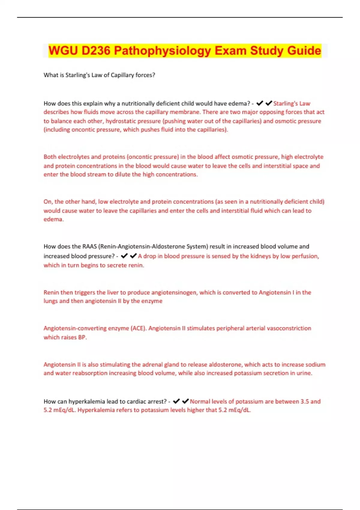 What is Starling's Law of Capillary forces? How does this explain why a nutritionally deficient child would have edema? - Starling's Law describes how fluids move across the capillary membrane. There are two major opposing forces that act to balance each other, hydrostatic pressure (pushing water out of the capillaries) and osmotic pressure (including oncontic pressure, which pushes fluid into the capillaries). Both electrolytes and proteins (oncontic pressure) in the blood affect osmotic pressure, high electrolyte and protein concentrations in the blood would cause water to leave the cells and interstitial space and enter the blood stream to dilute the high concentrations. On, the other hand, low electrolyte and protein concentrations (as seen in a nutritionally deficient child) would cause water to leave the capillaries and enter the cells and interstitial fluid which can lead to edema. How does the RAAS (Renin-Angiotensin-Aldosterone System) result in increased blood volume and increased blood pressure? - A drop in blood pressure is sensed by the kidneys by low perfusion, which in turn begins to secrete renin. Renin then triggers the liver to produce angiotensinogen, which is converted to Angiotensin I in the lungs and then angiotensin II by the enzyme Angiotensin-converting enzyme (ACE). Angiotensin II stimulates peripheral arterial vasoconstriction which raises BP. Angiotensin II is also stimulating the adrenal gland to release aldosterone, which acts to increase sodium and water reabsorption increasing blood volume, while also increased potassium secretion in urine. How can hyperkalemia lead to cardiac arrest?