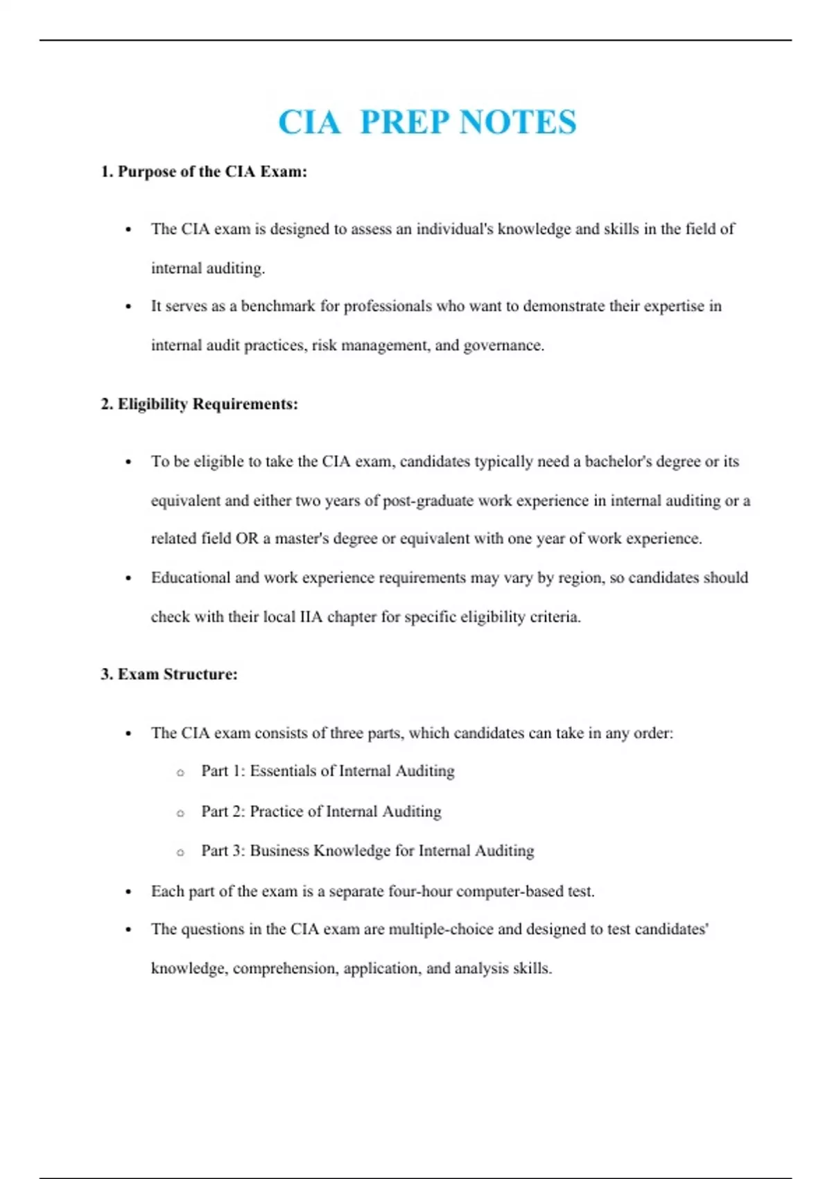 Unlock Success on the CIA Exam with Our Comprehensive Guide! Are you aspiring to become a Certified Internal Auditor (CIA) and looking for a trusted resource to help you ace the exam? Look no further! Our meticulously crafted guide offers you the ultimate roadmap to CIA certification success. What You'll Discover Inside: Detailed Content Coverage: Our guide breaks down each exam part, providing comprehensive coverage of essential topics, from internal auditing principles to business knowledge. Effective Study Strategies: Learn how to create a personalized study plan, manage your time efficiently, and leverage practice tests to assess your readiness. Test-Taking Techniques: Discover valuable tips and strategies for tackling multiple-choice questions, managing time during the exam, and maintaining a confident mindset. Score Like a Pro: Gain insights into how the CIA exam is scored, interpret score reports, and develop strategies for continuous improvement. Career Advancement: Explore the career benefits of CIA certification, including increased job prospects, professional recognition, and opportunities for specialization. Comprehensive Resources: Access recommended official IIA materials, third-party review courses, and online resources to turbocharge your preparation. Post-Exam Path: Navigate the post-exam certification process, including meeting experience requirements, adhering to ethical standards, and fulfilling ongoing education requirements. Global Recognition: Discover how CIA certification is recognized globally and opens doors to a world of opportunities. Career Advancement: Gain insights into the next steps for career advancement, including pursuing additional designations and leveraging mentorship and networking opportunities. Our guide is meticulously structured to equip you with the knowledge, strategies, and confidence needed to excel on the CIA exam and advance your career in internal auditing. Whether you're just starting or on the final stretch of your CIA journey, our comprehensive notes are your key to success! Don't miss this opportunity to invest in your professional future. Get your copy today and embark on your path to CIA certification success. Secure Your CIA Certification Now!
