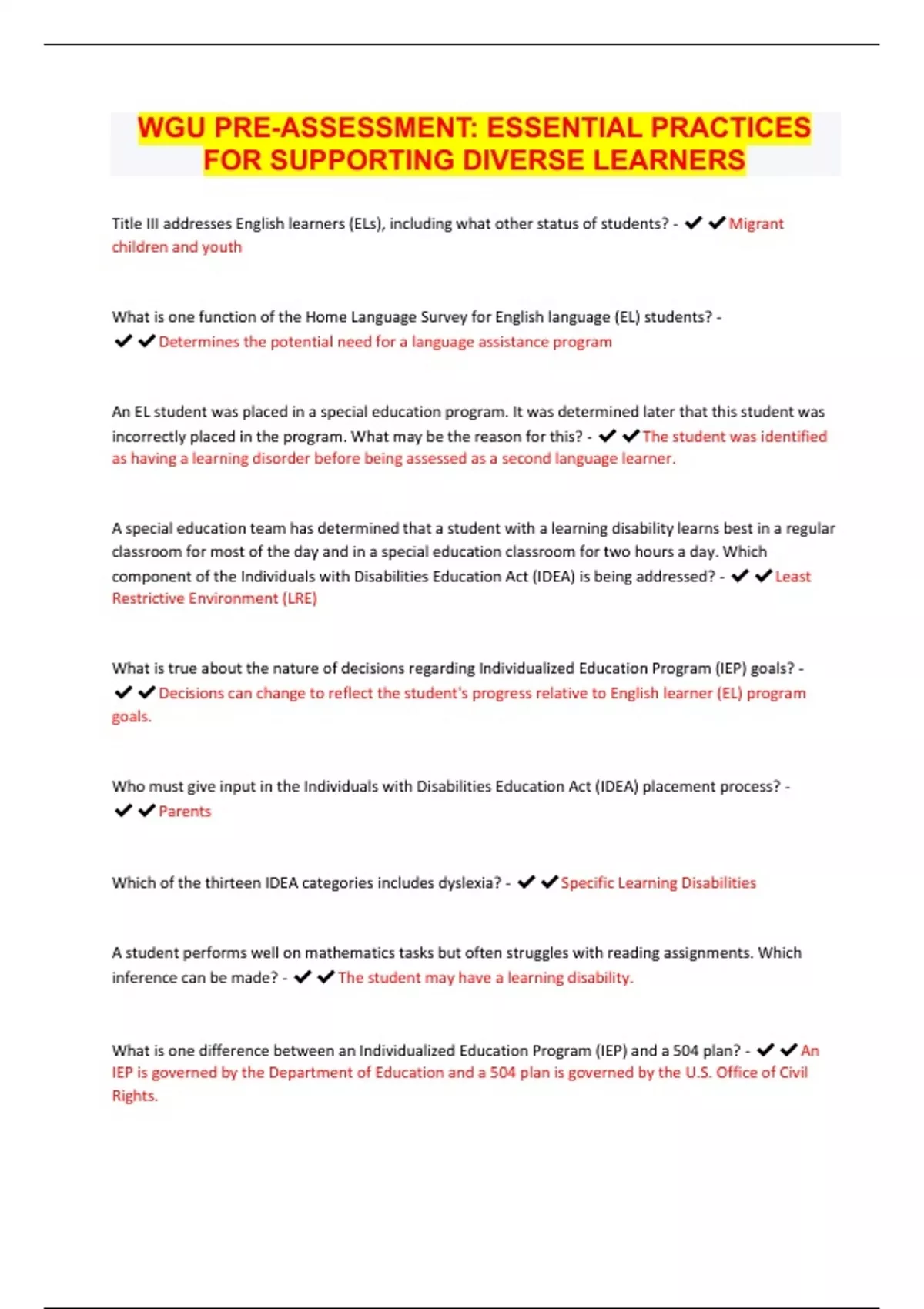 WGU PRE-ASSESSMENT: ESSENTIAL PRACTICES FOR SUPPORTING DIVERSE LEARNERS | Latest 2023/24 | Updated & Verified | Guaranteed Success