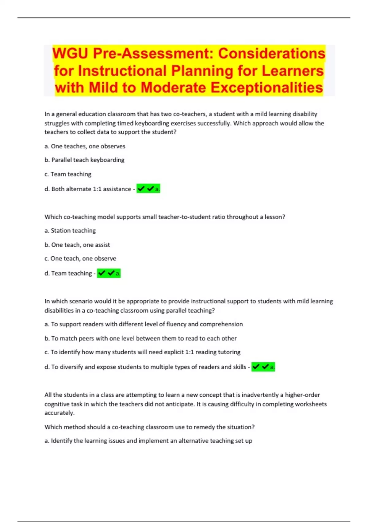 In a general education classroom that has two co-teachers, a student with a mild learning disability struggles with completing timed keyboarding exercises successfully. Which approach would allow the teachers to collect data to support the student? a. One teaches, one observes b. Parallel teach keyboarding c. Team teaching d. Both alternate 1:1 assistance - a. Which co-teaching model supports small teacher-to-student ratio throughout a lesson? a. Station teaching b. One teach, one assist c. One teach, one observe d. Team teaching - a. In which scenario would it be appropriate to provide instructional support to students with mild learning disabilities in a co-teaching classroom using parallel teaching? a. To support readers with different level of fluency and comprehension b. To match peers with one level between them to read to each other c. To identify how many students will need explicit 1:1 reading tutoring d. To diversify and expose students to multiple types of readers and skills - a. All the students in a class are attempting to learn a new concept that is inadvertently a higher-order cognitive task in which the teachers did not anticipate. It is causing difficulty in completing worksheets accurately. Which method should a co-teaching classroom use to remedy the situation? a. Identify the learning issues and implement an alternative teaching set upb. Re-teach the concept repeatedly until all students acquire understanding c. Select typically higher achieving student to assist in co-teaching the conept d. Eliminate the concept and materials from the lesson plan and continue onward - a. Which co-teaching method could general and special education teachers employ with the whole class to introduce and model how metacognition works while reading? a. Team teaching: One models reading behavior aloud; while the other provides instruction of concepts on board b. Parallel teaching: One models reading behavior with students of IEPs, while the other models with rest of class c. One assist, one teachers: One models reading behavior to the whole class, while the other works quietly 1:1 with tudents with IEP d. Station teaching: Both teachers periodically rotate tations that include reading behavior tasks, which students practice - a.
