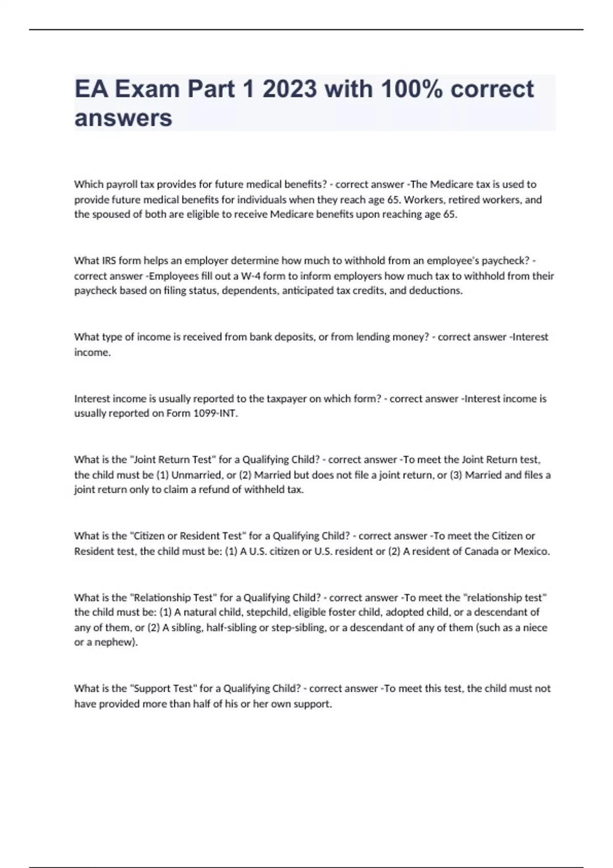 Which payroll tax provides for future medical benefits? - correct answer -The Medicare tax is used to provide future medical benefits for individuals when they reach age 65. Workers, retired workers, and the spoused of both are eligible to receive Medicare benefits upon reaching age 65. What IRS form helps an employer determine how much to withhold from an employee's paycheck? - correct answer -Employees fill out a W-4 form to inform employers how much tax to withhold from their paycheck based on filing status, dependents, anticipated tax credits, and deductions. What type of income is received from bank deposits, or from lending money? - correct answer -Interest income. Interest income is usually reported to the taxpayer on which form? - correct answer -Interest income is usually reported on Form 1099-INT. What is the "Joint Return Test" for a Qualifying Child? - correct answer -To meet the Joint Return test, the child must be (1) Unmarried, or (2) Married but does not file a joint return, or (3) Married and files a joint return only to claim a refund of withheld tax. What is the "Citizen or Resident Test" for a Qualifying Child? - correct answer -To meet the Citizen or Resident test, the child must be: (1) A U.S. citizen or U.S. resident or (2) A resident of Canada or Mexico. What is the "Relationship Test" for a Qualifying Child? - correct answer -To meet the "relationship test" the child must be: (1) A natural child, stepchild, eligible foster child, adopted child, or a descendant of any of them, or (2) A sibling, half-sibling or step-sibling, or a descendant of any of them (such as a niece or a nephew). What is the "Support Test" for a Qualifying Child? - correct answer -To meet this test, the child must not have provided more than half of his or her own support. What form is used to report noncash charitable contributions that exceed $500? - correct answer -Form 8283, Noncash Charitable Contributions, is used to report noncash charitable contributions that exceed $500. If a person willfully avoids paying taxes, they may be accused of this: - correct answer -Tax evasion How are court damages recovered for personal physical injury or sickness treated, for tax purposes? - correct answer -Damages received as compensation for a physical personal injury or illness are not taxable to the recipient. Are punitive damages included in a taxpayer's gross income? - correct answer -Punitive damages are generally taxable, even if the punitive damages were related to a settlement for personal physical injuries or physical sickness. Which IRS fo