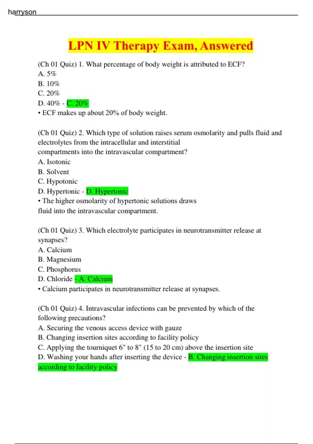 Lpn iv therapy exam answeredLPN IV Therapy Exam, Answered (Ch 01 Quiz) 1. What percentage of body weight is attributed to ECF? A. 5% B. 10% C. 20% D. 40% - C. 20% • ECF makes up about 20% of body weight. (Ch 01 Quiz) 2. Which type of solution raises serum osmolarity and pulls fluid and electrolytes from the intracellular and interstitial compartments into the intravascular compartment? A. Isotonic B. Solvent C. Hypotonic D. Hypertonic - D. Hypertonic • The higher osmolarity of hypertonic solutions draws fluid into the intravascular compartment. (Ch 01 Quiz) 3. Which electrolyte participates in neurotransmitter release at synapses? A. Calcium B. Magnesium C. Phosphorus D. Chloride - A. Calcium • Calcium participates in neurotransmitter release at synapses. (Ch 01 Quiz) 4. Intravascular infections can be prevented by which of the following precautions? A. Securing the venous access device with gauze B. Changing insertion sites according to facility policy C. Applying the tourniquet 6" to 8" (15 to 20 cm) above the insertion site D. Washing your hands after inserting the device - B. Changing insertion sites according to facility policy harryson • Intravascular infection can be prevented by alternating insertion sites. (Ch 01 Quiz) 5. When capillary blood pressure exceeds colloid osmotic pressure: A. water and diffusible solutes leave the capillaries and circulate into the ISF. B. water and diffusible solutes return to the capillaries. C. there's no change. D. intake and output are affected. - A. water and diffusible solutes leave the capillaries and circulate into the ISF. • When capillary blood pressure exceeds colloid osmotic pressure, water and diffusible solutes leave the capillaries and circulate into the ISF. When capillary blood pressure falls below colloid osmotic pressure, water and diffusible solutes return to the capillaries. (Ch 04 Quiz) 1. I.V. medication may be indicated when: A. the patient needs a slower therapeutic effect. B. the medication can't be absorbed by the GI tract. C. the medication given orally is stable in gastric juices. D. the medication isn't irritating to muscle tissues. - B. the medication can't be absorbed by the GI tract. • I.V. medication has a rapid effect and may be indicated if the medication can't be absorbed by the GI tract, is unstable in gastric juices, or causes pain or tissue damage when given I.M. or subQ. (Ch 04 Quiz) 2. What's the preferred route of medication in emergencies? A. I.V. B. SubQ C. I.M. D. Oral - A. I.V. • The I.V. route allows therapeutic levels to be achieved rapidly. (Ch 04 Quiz) 3. Loading dose, lock-out interval, and maintenance doses are basic to: A. I.V. therapy. B. PCA therapy. C. continuous I.V. morphine drips. harryson D. TPN. - B. PCA therapy. • These concepts are basic to PCA therapy. (Ch 04 Quiz) 4. A patient receiving I.V. therapy has redness at the I.V. site. The patient denies feeling pain at the area. These findings suggest what degree of phlebitis? A. 4+ B. 3+ C. 2+ D. 1+ - D. 1+ • According to the Intravenous Nurses Society Revised Standards of Practice, phlebitis that involves erythema with or without pain is classified as 1+. (Ch 04 Quiz) 5. Elderly patients are more prone to which complications of I.V. therapy? A. Hypersensitivity B. Phlebitis C. Infection D. Extravasation - B. Phlebitis • Because many elderly patients have fragile veins, they're more prone to phlebitis and infiltration. (Ch 04 Quiz) 6. The one way to prevent extravasation is by: A. using a high-pressure pump to infuse vesicants. B. using a small vein to insert the access device. C. using a gauze dressing over the insertion site. D. using an existing I.V. catheter only after patency has been assured. - D. using an existing I.V. catheter only after patency has been assured. • An existing I.V. catheter should only be used after its patency has been assessed. If the catheter isn't patent, perform a new venipuncture to ensure correct catheter placement and vein patency. (Ch 01 Review) Objectives of I.V. therapy: - • To restore and maintain fluid and electrolyte balance • To provide medications and chemotherapeutic agents