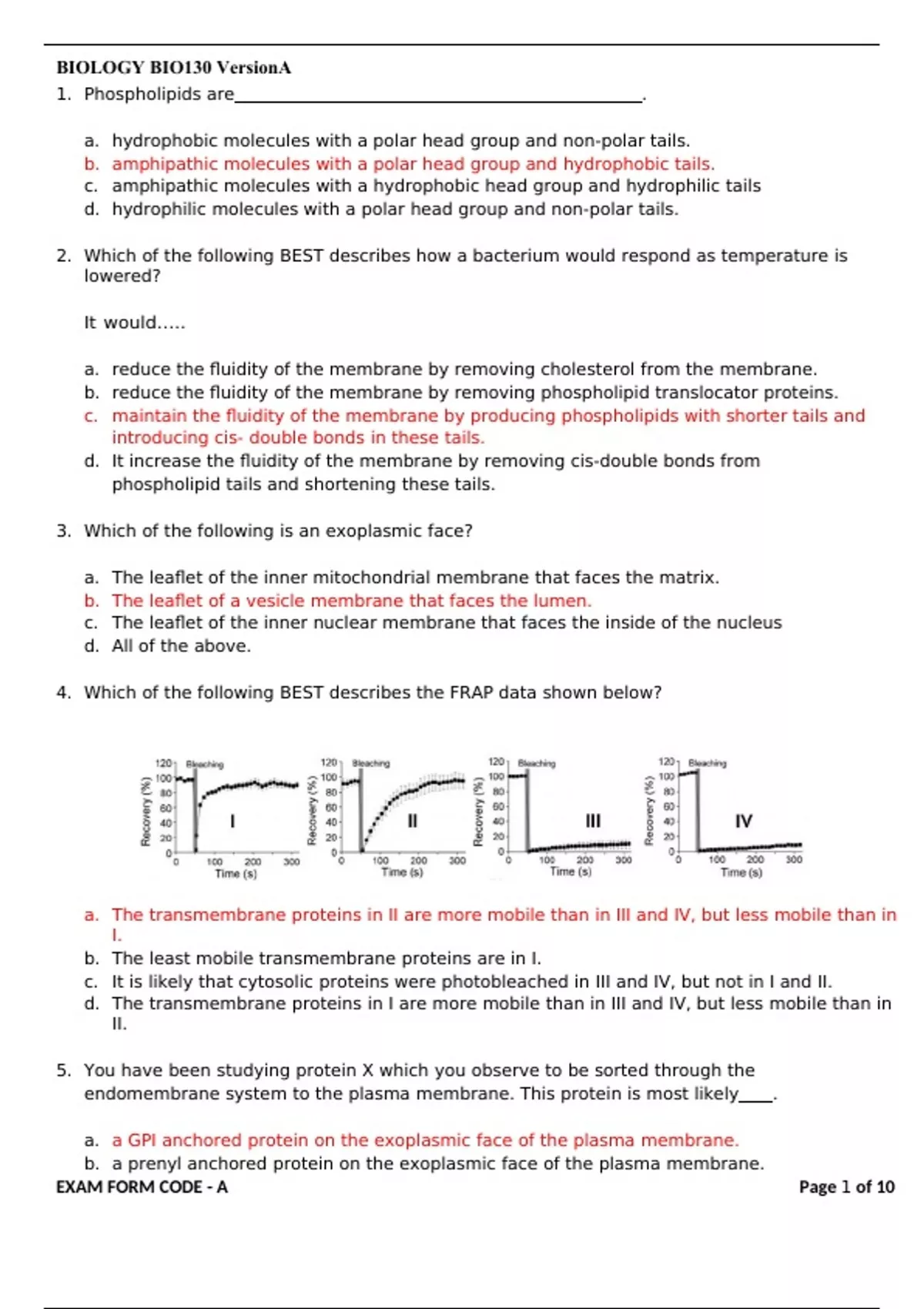 BIOLOGY BIO130 VersionA 1. Phospholipids are . a. hydrophobic molecules with a polar head group and non-polar tails. b. amphipathic molecules with a polar head group and hydrophobic tails. c. amphipathic molecules with a hydrophobic head group and hydrophilic tails d. hydrophilic molecules with a polar head group and non-polar tails. 2. Which of the following BEST describes how a bacterium would respond as temperature is lowered? It would….. a. reduce the fluidity of the membrane by removing cholesterol from the membrane. b. reduce the fluidity of the membrane by removing phospholipid translocator proteins. c. maintain the fluidity of the membrane by producing phospholipids with shorter tails and introducing cis- double bonds in these tails. d. It increase the fluidity of the membrane by removing cis-double bonds from phospholipid tails and shortening these tails. 3. Which of the following is an exoplasmic face? a. The leaflet of the inner mitochondrial membrane that faces the matrix. b. The leaflet of a vesicle membrane that faces the lumen. c. The leaflet of the inner nuclear membrane that faces the inside of the nucleus d. All of the above. 4. Which of the following BEST describes the FRAP data shown below? a. The transmembrane proteins in II are more mobile than in III and IV, but less mobile than in I. b. The least mobile transmembrane proteins are in I. c. It is likely that cytosolic proteins were photobleached in III and IV, but not in I and II. d. The transmembrane proteins in I are more mobile than in III and IV, but less mobile than in II. 5. You have been studying protein X which you observe to be sorted through the endomembrane system to the plasma membrane. This protein is most likely . a. a GPI anchored protein on the exoplasmic face of the plasma membrane. b. a prenyl anchored protein on the exoplasmic face of the plasma membrane. c. a prenyl anchored protein on the cytosolic face of the plasma membrane. d. a GPI anchored protein on the cytosolic face of the plasma membrane. 6. Multipass integral membrane proteins are . a. hydrophobic. b. hydrophilic. c. amphipathic. d. channel proteins but not transporters. 7. Which of the following most directly stops net transport by the Na+/glucose symporter? a. Decreasing ATP. b. Reversing the glucose concentration. c. Equalizing the Na+ electrochemical gradient on both sides of the membrane. d. Increasing Na+/K+ pump activity. 8. A toxicologist is trying to determine how a particular poison works. She decides to culture epithelial cells and then adds the poison. The membrane potential immediately changes from approximately -100 mV (without the poison) to approximately -10 mV (with the poison). Which of the following hypotheses is the most logical? a. The poison stops the activity of K+ leak channels. b. The poison increases the activity of lysosomal V-type ATPases. c. The poison stops the activity of ABC transporters. d. The poison stops the activity of Na+/H+ exchangers. 9. Which of the following is correctly ordered from the molecule which moves the fastest across a lipid bilayer (with no transport proteins) to the molecule which moves the slowest? a. Water, Oxygen, Glucose, Sodium ions, DNA. b. Glucose, Oxygen, Water, DNA, Sodium ions. c. Oxygen, Water, Glucose, Sodium ions, DNA. d. Oxygen, Water, Glucose, DNA, Sodium ions. 10. How would the Na+/H+ exchanger respond to a decrease in cytosolic pH? a. It increases the rate that H+ is pumped out of the cell and Na+ is pumped into the cell. b. It increases the rate that H+ and Na+ are pumped into the cell. c. It decreases the rate that H+ is pumped out of the cell and Na+ is pumped into the cell. d. It decreases the rate that H+ and Na+ are pumped into the cell. 11. During the pumping cycle of the Na+/K+ pump, which of the following BEST describes an occluded conformation? a. Bound to two K+ ions and releasing three Na+ ions. b. Bound to either two K+ ions or three Na+ ions. c. Bound to three K+ ions and releasing two Na+ ions. d. Bound to either three K+ ions or two Na+ ions. 12. Which of the following is required for transcellular transport of glucose across the epithelial cells that line the small intestine? a. K+ from the lumen of the intestine. b. Na+ from the lumen of the intestine. c. A higher concentration of glucose in the blood stream than in the cytosol of the epithelial cell. d. A higher concentration of Na+ in the cytosol of the epithelial cell than in the extracellular fluid on the basolateral side of the epithelial cell. 13. If a mutation in the signal sequence delivered the ATP synthase complex to the lysosome membrane with the ATPase domain located in the cytosol, what would you expect to observe? a. If no ATP was available in the cytosol, the ATP synthase would acidify the lysosome lumen. b. If ADP was not available, the ATP synthase would acidify the cytosol. c. As long as a supply of ATP was available in the cytosol, the ATP synthase would function like a V-type ATPase. d. The ATP synthase would not allow any protons to move across the membrane. 14. A bioinformatician is searching the genome for genes that encode for secreted proteins. Which of the following should she look for? Genes that encode for… a. introns (splice sites) close to the start codon. b. proteins that are entirely hydrophilic. c. proteins with hydrophilic amino acids at both their N-terminus and C-terminus, with hydrophobic amino acids in the middle. d. proteins with hydrophobic amino acids at their N-terminus. 15. Which of the following allows for unregulated free diffusion of Ca++? a. Vesicular membranes. b. Peroxisomal membranes. c. The nuclear pore complex. d. The endoplasmic reticulum translocator. 16. What might you conclude about a protein in the endoplasmic reticulum that does not bind to any membrane associated sorting receptors in the endoplasmic reticulum membrane? a. It is a protein that is normally resident in mitochondria but the signal sequence has been mutated. b. It is a prote