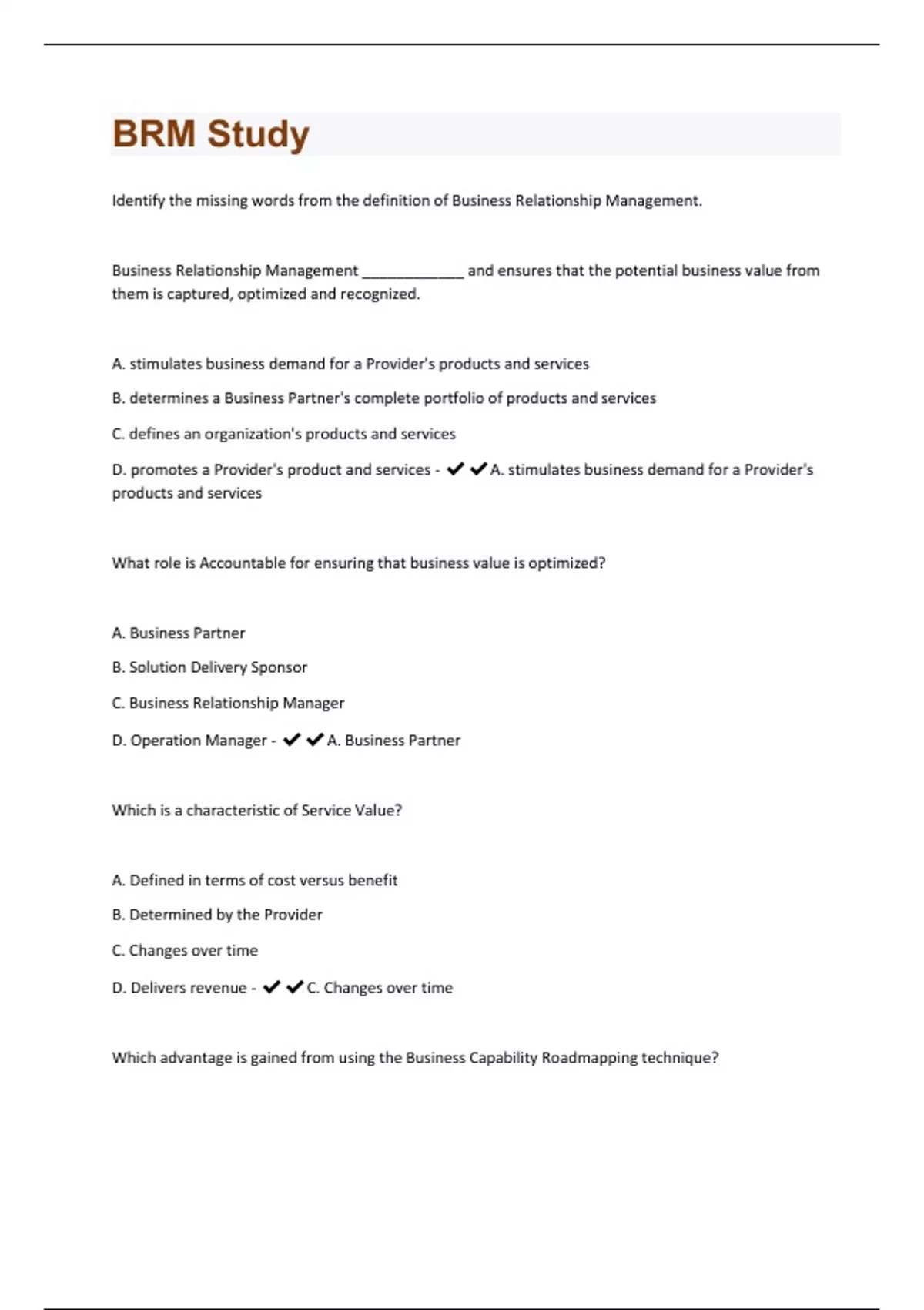 Identify the missing words from the definition of Business Relationship Management. Business Relationship Management ____________ and ensures that the potential business value from them is captured, optimized and recognized. A. stimulates business demand for a Provider's products and services B. determines a Business Partner's complete portfolio of products and services C. defines an organization's products and services D. promotes a Provider's product and services - A. stimulates business demand for a Provider's products and services What role is Accountable for ensuring that business value is optimized? A. Business Partner B. Solution Delivery Sponsor C. Business Relationship Manager D. Operation Manager - A. Business Partner Which is a characteristic of Service Value? A. Defined in terms of cost versus benefit B. Determined by the Provider C. Changes over time D. Delivers revenue - C. Changes over time Which advantage is gained from using the Business Capability Roadmapping technique?A. Opportunities with a Business Partner and Provider are defined in a way that is clear, compelling and convincing B. Conversations are held that help increase both business and Provider understanding C. Clear accountability for the making of a decision is established D. The importance of a business and Provider relationship is identified - B. Conversations are held that help increase both business and Provider understanding When using the Value Management Process, in which sequence should the stages be performed? 1. Create Value Plan 2. Capture and Communicate Value 3. Approve Business Case. A. 1, 2, 3 B. 1, 3, 2 C. 2, 1, 3 D. 3, 2, 1 - B. 1, 3, 2 In the Influence Process technique, what should be used to Frame a Conversation? A. Forceful arguments B. Defensive explanations C. Truth about today D. Engagement of Stakeholders - C. Truth about today