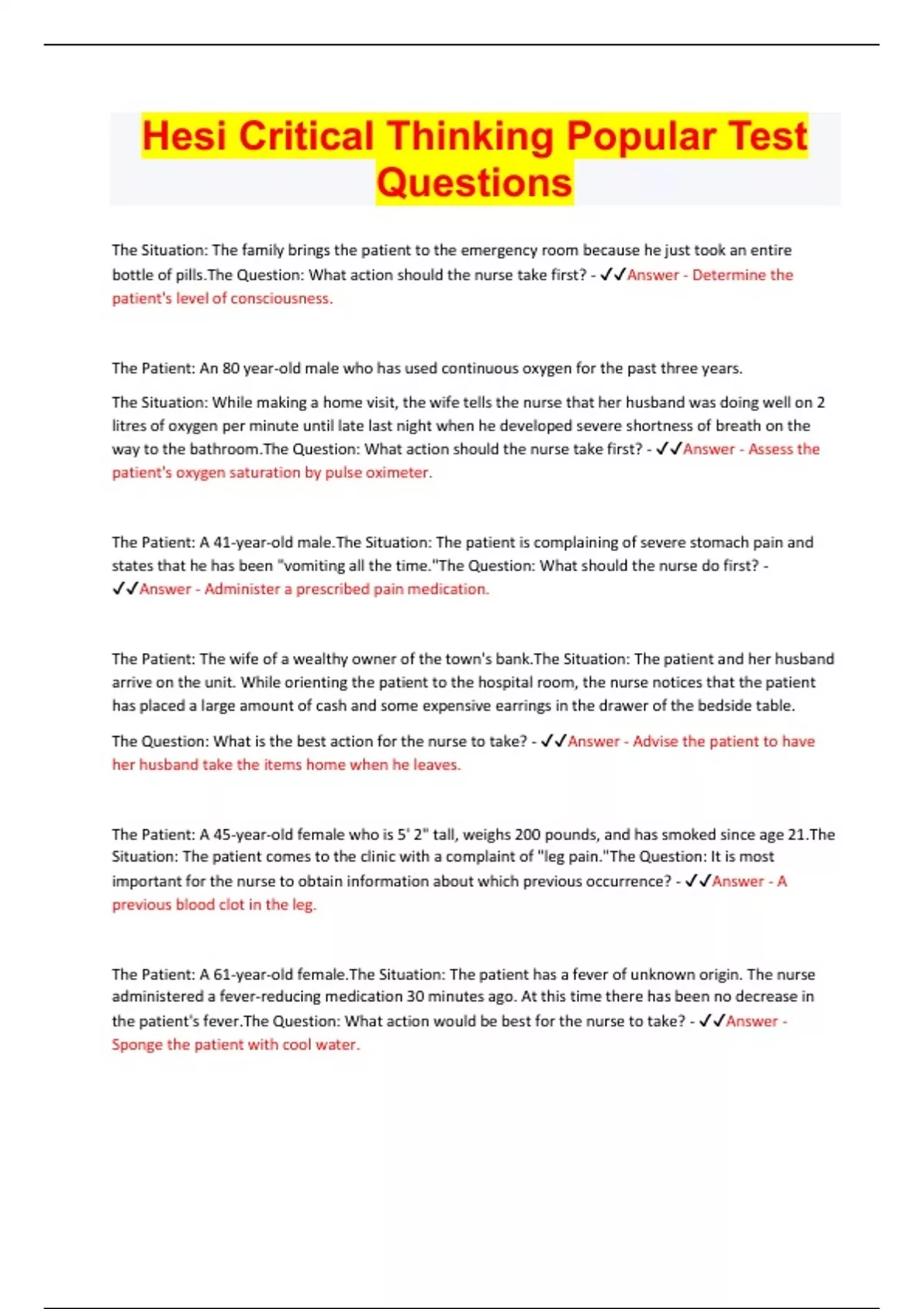 The Situation: The family brings the patient to the emergency room because he just took an entire bottle of pills.The Question: What action should the nurse take first? - Answer - Determine the patient's level of consciousness. The Patient: An 80 year-old male who has used continuous oxygen for the past three years. The Situation: While making a home visit, the wife tells the nurse that her husband was doing well on 2 litres of oxygen per minute until late last night when he developed severe shortness of breath on the way to the bathroom.The Question: What action should the nurse take first? - Answer - Assess the patient's oxygen saturation by pulse oximeter. The Patient: A 41-year-old male.The Situation: The patient is complaining of severe stomach pain and states that he has been "vomiting all the time."The Question: What should the nurse do first? - Answer - Administer a prescribed pain medication. The Patient: The wife of a wealthy owner of the town's bank.The Situation: The patient and her husband arrive on the unit. While orienting the patient to the hospital room, the nurse notices that the patient has placed a large amount of cash and some expensive earrings in the drawer of the bedside table. The Question: What is the best action for the nurse to take? - Answer - Advise the patient to have her husband take the items home when he leaves. The Patient: A 45-year-old female who is 5' 2" tall, weighs 200 pounds, and has smoked since age 21.The Situation: The patient comes to the clinic with a complaint of "leg pain."The Question: It is most important for the nurse to obtain information about which previous occurrence? - Answer - A previous blood clot in the leg. The Patient: A 61-year-old female.The Situation: The patient has a fever of unknown origin. The nurse administered a fever-reducing medication 30 minutes ago. At this time there has been no decrease in the patient's fever.The Question: What action would be best for the nurse to take? - Answer - Sponge the patient with cool water.