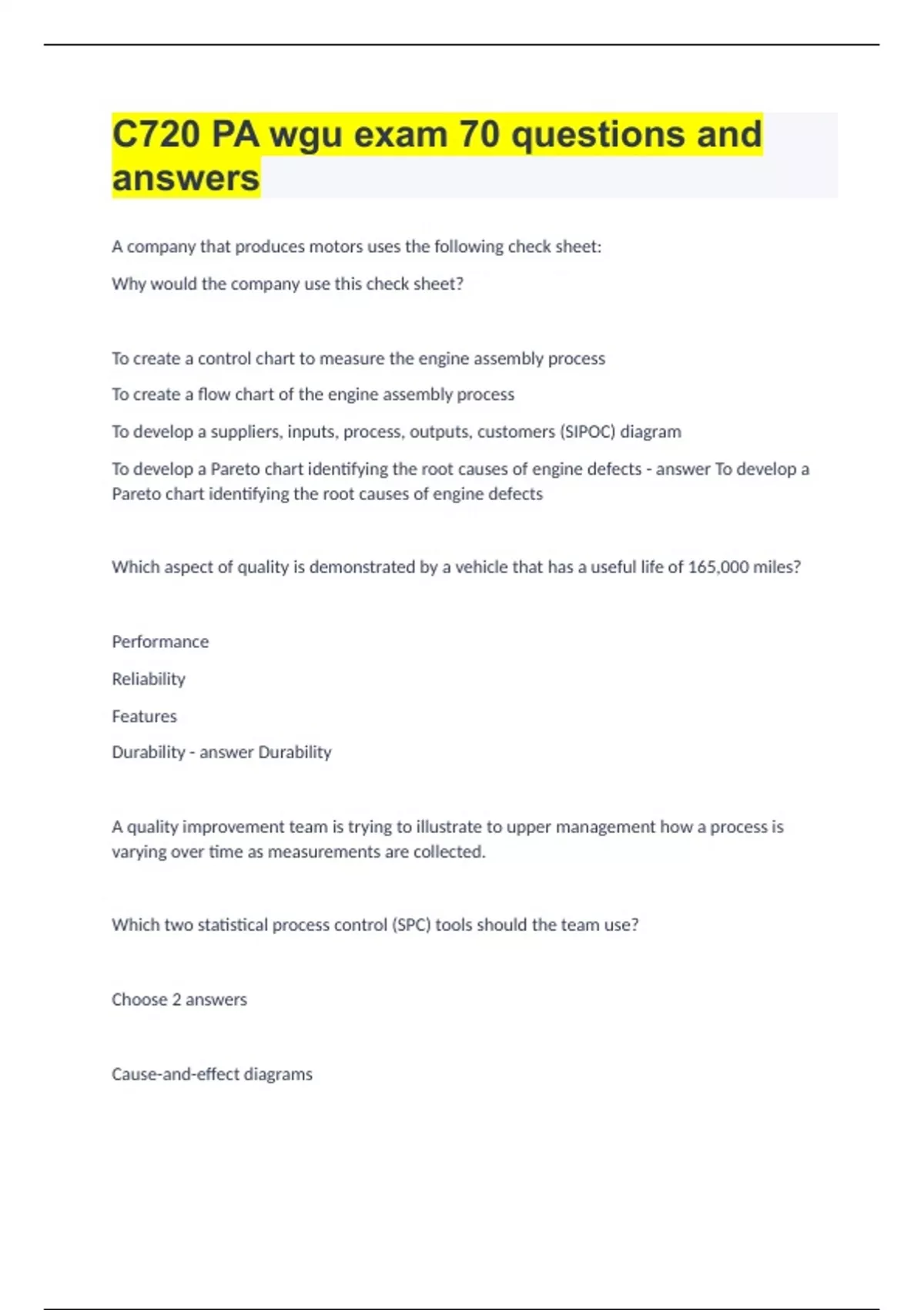 A company that produces motors uses the following check sheet: Why would the company use this check sheet? To create a control chart to measure the engine assembly process To create a flow chart of the engine assembly process To develop a suppliers, inputs, process, outputs, customers (SIPOC) diagram To develop a Pareto chart identifying the root causes of engine defects To develop a Pareto chart identifying the root causes of engine defects Which aspect of quality is demonstrated by a vehicle that has a useful life of 165,000 miles? Performance Reliability Features Durability Durability A quality improvement team is trying to illustrate to upper management how a process is varying over time as measurements are collected. Which two statistical process control (SPC) tools should the team use? Choose 2 answers Cause-and-effect diagrams Scatter diagrams Histograms Run charts Check sheets Pareto charts Control charts Control charts Run charts The CEO of a service company wants to change the strategy of the company from volume sales to high-quality products. Which philosophy should the CEO implement to emphasize quality over volume? Shewhart's variation reduction Deming's 14 points Ohno and Shingo's kaizen Taguchi's loss function Deming's 14 points A company sells garage doors through a national retailer and contracts with local installers to complete the installations. The operations manager is responsible for completing the installations in a 14-day period after the sale. The company will be penalized financially if it fails to achieve these objectives. The operations manager's daily responsibilities include contacting installers to expedite orders and ensure deadlines are met. Which two tools that should be used to measure installer performance? Choose 2 answers Control charts to measure the time elapsed to completion Fishbone diagram to chart the method, material, machine, and manpower Gantt chart to measure how much performance has improved Run charts to chart output around the 14-day central tendency Control charts to measure the time elapsed to completion Run charts to chart output around the 14-day central tendency Which quality tool examines patterns, flow, and causes of variation of data points over time? Quality function deployment Cause-and-effect matrix Students t-test Statistical process control Statistical process control A vice president of a major retailer is trying to reduce the wait time for customers in the checkout line by appropriately opening checkout lines. To do this, the VP needs to know the relationship and degree of correlation between monthly customer visits and area population. Which tool should be used in this situation? Pareto chart Control chart Scatter plot Histogram Scatter plot Which two company practices reflect the guiding principles of Six Sigma? Choose 2 answers A company tries to reduce variation in the quality of products it offers. A company emphasizes the quality of suppliers because the quality of outputs are determined by the quality of inputs. A company emphasizes the variety of suppliers because the variety of outputs are determined by the variety of inputs. A company tries to reduce the variety in the kinds of products it offers. A company tries to reduce variation in the quality of products it offers. A company emphasizes the quality of suppliers because the quality of outputs are determined by the quality of inputs. Six Sigma is adopted by a manufacturing company. How can the company use Six Sigma to establish quality improvement? There should be no more than 3.4 defects per million products from a manufacturing company statistically. There should be no more than 6.8 defects per million products from a manufacturing company statistically. There should be no more than 15% of defects per million products from a manufacturing company statistically. There should be no more than 10% of defects per million products from a manufacturing company statistically. There should be no more than 3.4 defects per million products from a manufacturing company statistically. A company makes rulers that are designed to be 20 cm in length with allowance ±0.1 cm. If the actual length of a ruler is 20.2 cm, which factor will the company use to judge the quality of the length of the rulers? Performance Features Conformance Serviceability Aesthetics Conformance Which quality management philosophy uses cause-and-effect fishbone diagrams for root-cause analysis, emphasizes a bottom-up approach to quality, and considers standardization and quality control to move together in improvement? Six Sigma Goldratt's theory of constraints Deming's 14 points for management Taguchi methods Ishikawa's quality circle Ishikawa's quality circle Which quality management philosophy assigns cost to quality, defines quality by how well a product can be used for its intended purpose, and uses Pareto charts? Deming's 14 points for management Juran Institute's management theory Taguchi methods Shewhart cycle Crosby's "Quality Is Free" Juran Institute's management theory A clothing retailer sends out evaluations to customers to rate quality as "outstanding," "good," "average," and "bad." If the retailer wants to know the annual frequency of each evaluation category, which tool should the retailer use? Pareto chart Control chart Scatter plot Histogram Histogram An appliance manufacturer has two factories located around the world, each with its own capacity: • F1 can make 8 appliances per day. • F2 can make 10 per day. The factories can deliver to two different distribution centers. Every day each distribution center must receive 9 appliances each. The cost to deliver appliances from each factory to each distribution center is listed in the table below: Distribution Center 1 Distribution Center 2 F1 $4 $3 F2 $8 $3 Using the factory production constraints and the delivery costs in the above matrix, what is the lowest cost to deliver all 18 appliances to the distribution centers? $3 $67 $81 