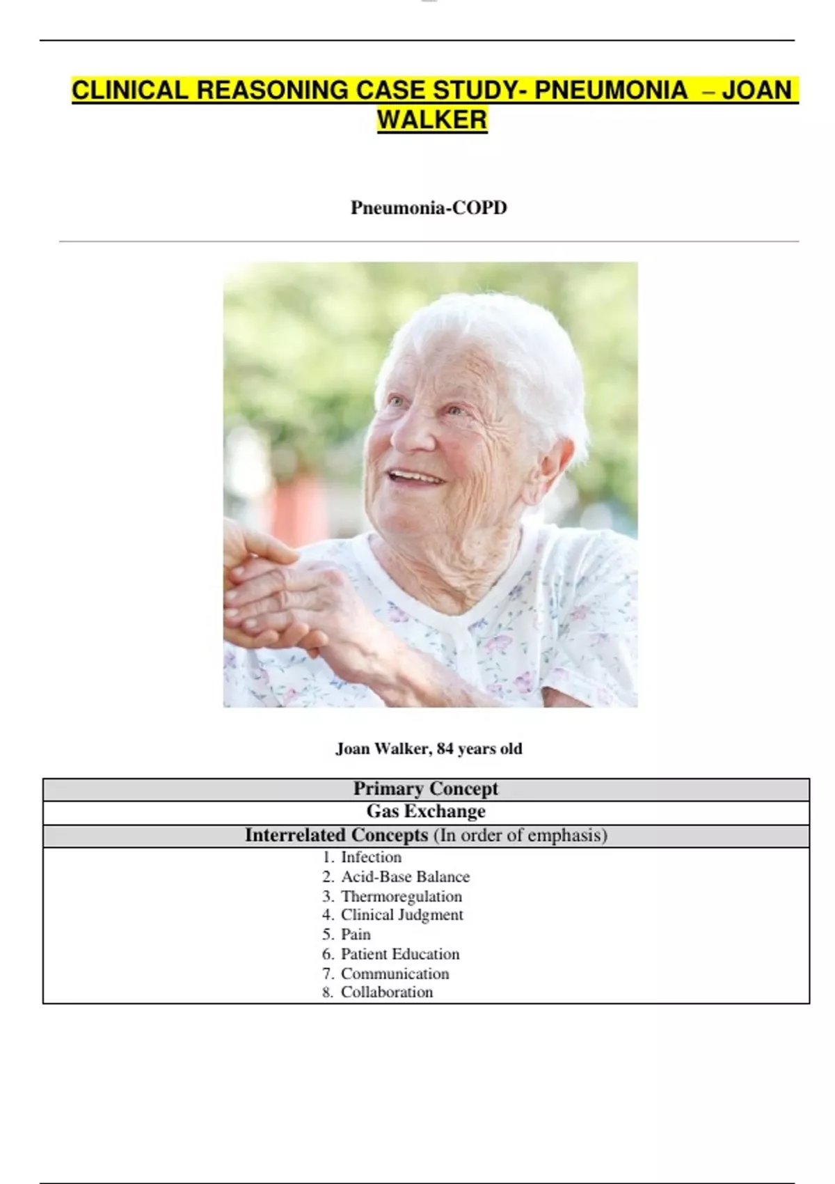 CLINICAL REASONING CASE STUDY- PNEUMONIA – JOAN WALKER Full analysis of the case from patient history, patient care, lab tests and results, and treatment. This document will help you in understanding how to care for pneumonia, also to understand case scenario exams and assignments.