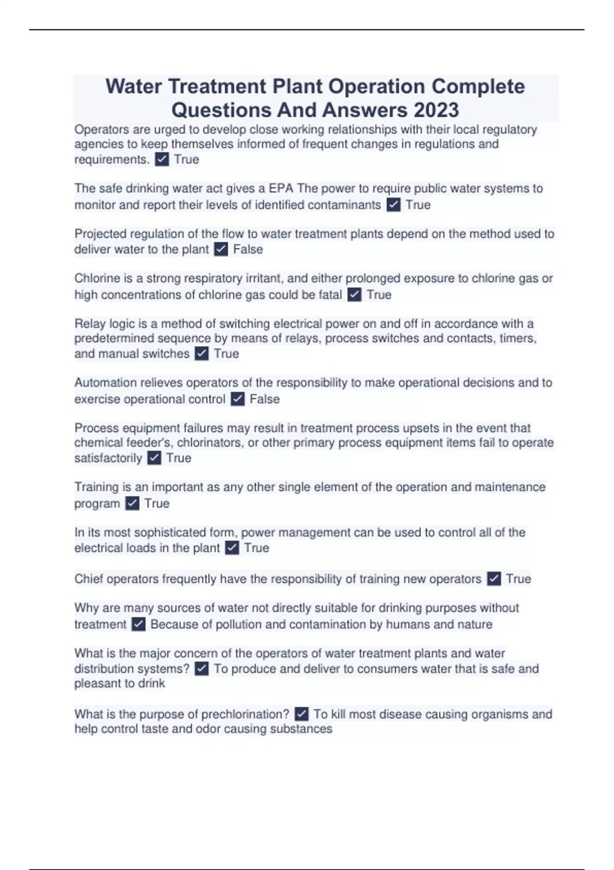 Water Treatment Plant Operation Complete Questions And Answers 2023
