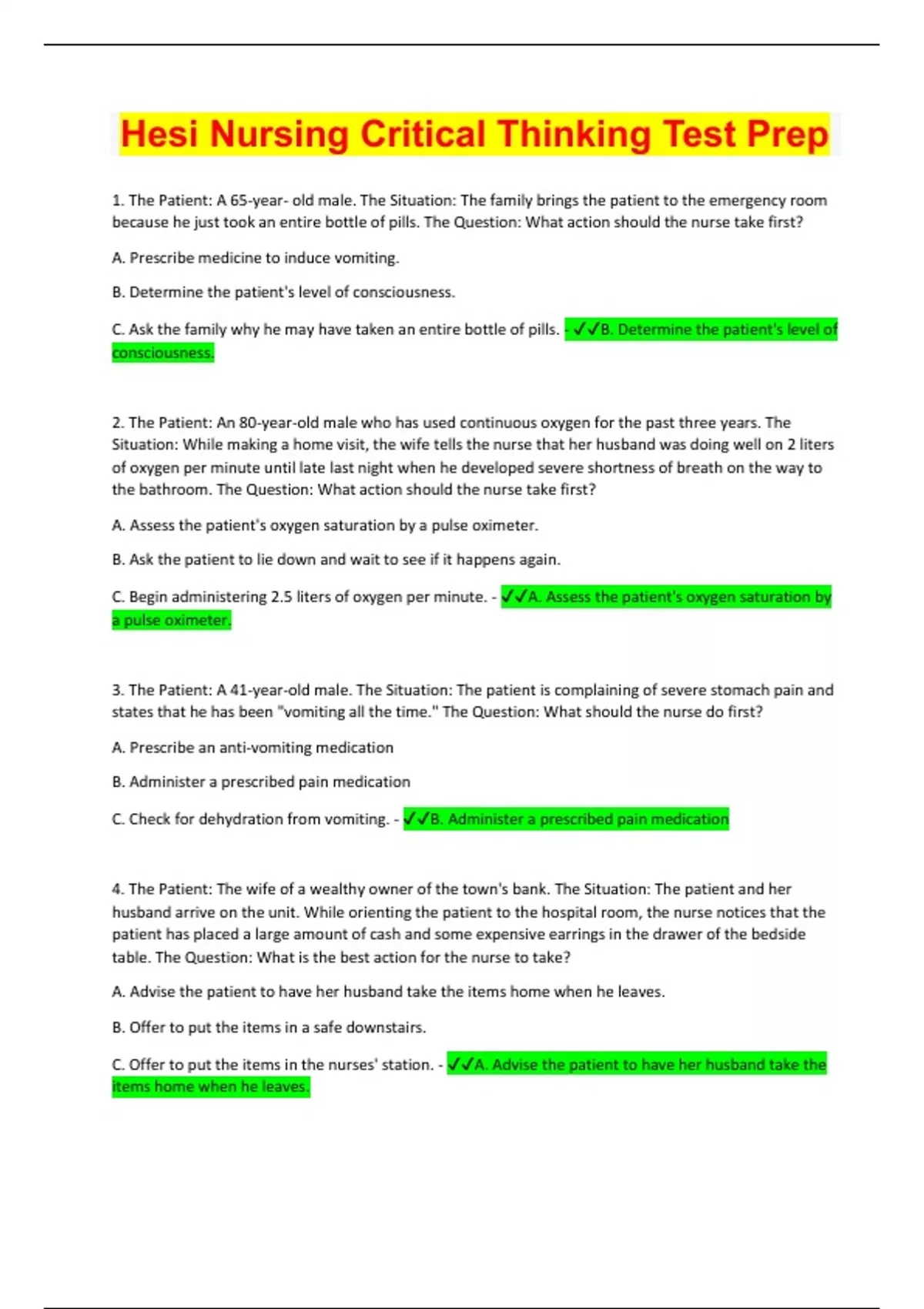 1. The Patient: A 65-year- old male. The Situation: The family brings the patient to the emergency room because he just took an entire bottle of pills. The Question: What action should the nurse take first? A. Prescribe medicine to induce vomiting. B. Determine the patient's level of consciousness. C. Ask the family why he may have taken an entire bottle of pills. - B. Determine the patient's level of consciousness. 2. The Patient: An 80-year-old male who has used continuous oxygen for the past three years. The Situation: While making a home visit, the wife tells the nurse that her husband was doing well on 2 liters of oxygen per minute until late last night when he developed severe shortness of breath on the way to the bathroom. The Question: What action should the nurse take first? A. Assess the patient's oxygen saturation by a pulse oximeter. B. Ask the patient to lie down and wait to see if it happens again. C. Begin administering 2.5 liters of oxygen per minute