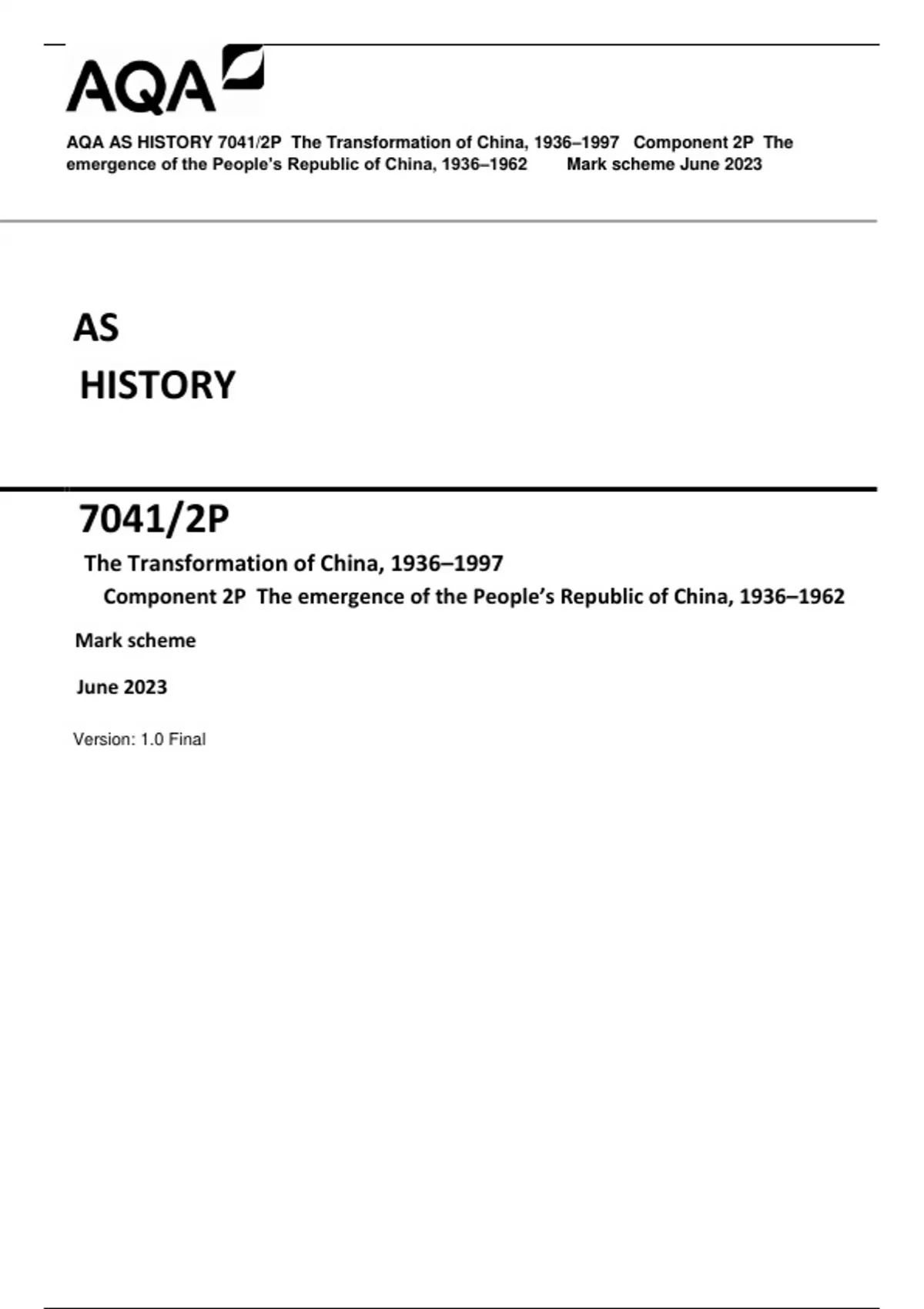 AQA AS HISTORY 7041/2P The Transformation of China, 1936–1997 Component 2P The emergence of the People’s Republic of China, 1936–1962 Mark scheme June 2023