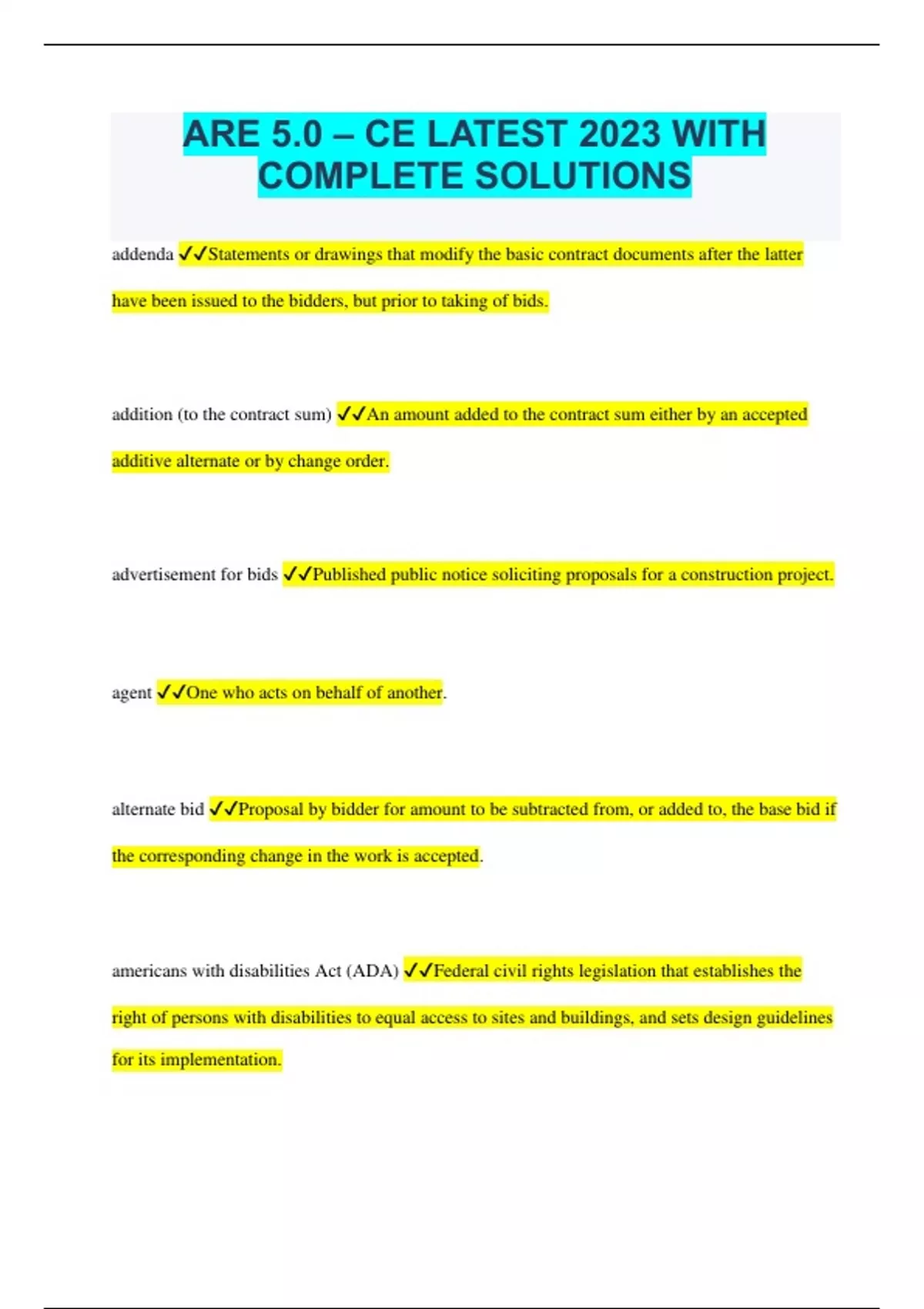 ARE 5.0 – CE LATEST 2023 WITH COMPLETE SOLUTIONS addenda Statements or drawings that modify the basic contract documents after the latter have been issued to the bidders, but prior to taking of bids. addition (to the contract sum) An amount added to the contract sum either by an accepted additive alternate or by change order. advertisement for bids Published public notice soliciting proposals for a construction project. agent One who acts on behalf of another. alternate bid Proposal by bidder for amount to be subtracted from, or added to, the base bid if the corresponding change in the work is accepted. americans with disabilities Act (ADA) Federal civil rights legislation that establishes the right of persons with disabilities to equal access to sites and buildings, and sets design guidelines for its implementation. application for payment Contractor's written request for payment of amount due on account of work completed and/or materials suitably stored on the site. Also called payment request. approved equal Material or method that is approved by the architect as being equivalent to what was originally specified. arbitration An alternative to litigating a dispute, in which one or more arbitrators hears the evidence and renders a decision. barrier-free provisions Regulations that provide for accessibility to buildings and sites for persons with disabilities. base bid The sum of money stated in the bid for which the bidder offers to do the work, not including any alternate bids. basic services The architectural services normally required for a building project, usually consisting of schematic design, design development, construction documents, bidding or negotiation, and construction contract administration. bid A proposal by a contractor to do the work required by the contract documents for a stipulated sum of money bid bond A surety bond guaranteeing that the bidder will sign a contract, if offered, in accordance with his or her proposal. bidding documents The invitation to bid, instructions to bidders, bid form, and the contract documents. bonus and penalty clause A provision in the construction contract for payment of a bonus to the contractor for completing the project prior to a specific date, and for a charge (penalty) against the contractor for failing to complete the project by that date. cash allowance An amount included in the contract sum to cover the cost of certain items not specified in detail. Hardware and other finish items are often handled in this manner. certificate for payment A statement by the architect informing the owner of the amount due the contractor on account of work completed and/or materials suitably stored. certificate of occupancy A document issued by the governing authority