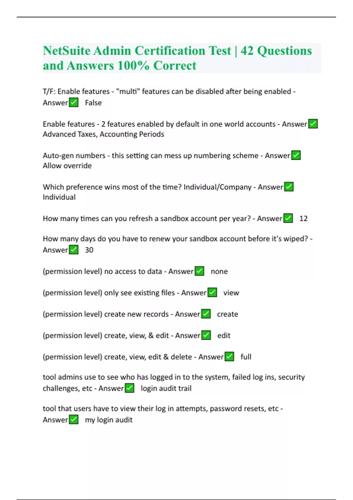NetSuite Admin Certification Test | 42 Questions and Answers 100% Correct