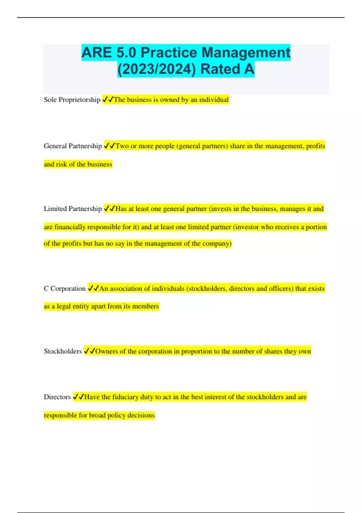 ARE 5.0 Practice Management (2023/2024) Rated A Sole Proprietorship The business is owned by an individual General Partnership Two or more people (general partners) share in the management, profits and risk of the business Limited Partnership Has at least one general partner (invests in the business, manages it and are financially responsible for it) and at least one limited partner (investor who receives a portion of the profits but has no say in the management of the company) C Corporation An association of individuals (stockholders, directors and officers) that exists as a legal entity apart from its members Stockholders Owners of the corporation in proportion to the number of shares they own Directors Have the fiduciary duty to act in the best interest of the stockholders and are responsible for broad policy decisions Officers Carry out the day-to-day management of the corporation S Corporation A corporation that chooses to allocate it's income and losses directly to shareholders in proportion to their holdings. Limited to small business corporations with less than 100 shareholders. Professional Corporation Similar to other corporations except that liability for malpractice is limited to the person responsible for the act. Limited Liability Company (LLC) Business structure that combines the advantages of a partnership or sole proprietorship with the limited liability of a corporation. (Aka LLP Limited Liability Partnership) Joint Venture A temporary association of two or more persons or firms for the purpose of completing a specific project or achieving a specific goal Teaming Agreement Defines the roles, responsibilities and contractual relationships that will be established if the firms are awarded the project and the joint venture is formed. (Aka Memorandum of Understanding) Memorandum of Understanding Defines the roles, responsibilities and contractual relationships that will be established if the firms are awarded the project and the joint venture is formed (Aka Teaming Agreement) Standard of Care The level of skill and diligence that a reasonably prudent architect would exercise in the same community, in the same time frame, and given the same or similar facts and circumstances Departmental Organization Staff is organized into departments, each of which specializes in a different function. A project moves from one department to another in its route from start to finish (Horizontal Organization or Flat Organization) Studio Organization Staff is organized in groups called studios. Each studio